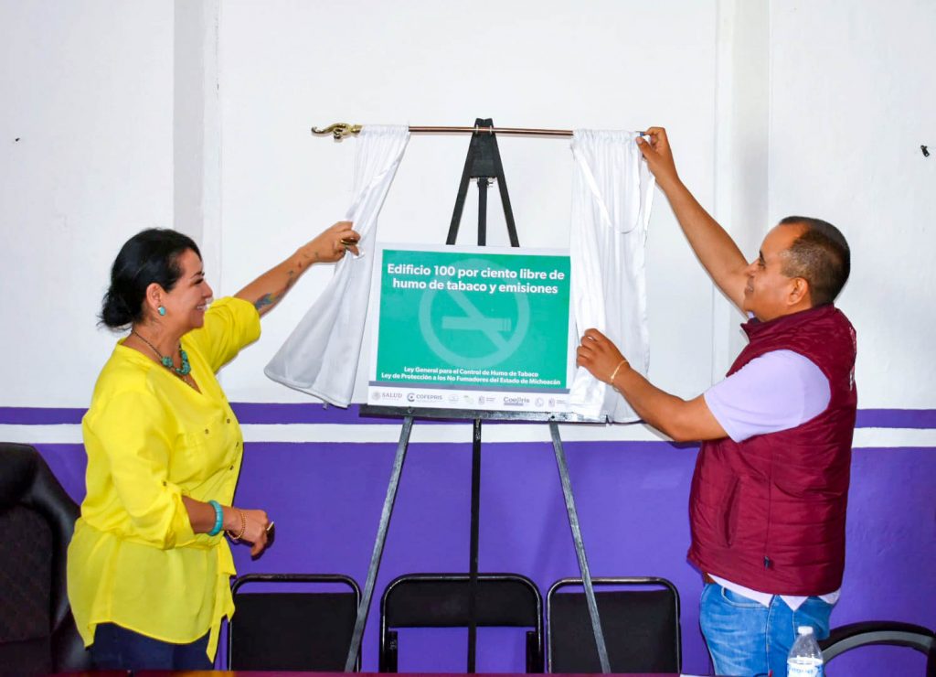 Penjamillo, Michoacán, 28 de febrero de 2023.- Para desalentar el hábito del cigarrillo y proteger a quienes no fuman, la Secretaría de Salud de Michoacán (SSM) declaró como Edificio 100% Libre de Humo de Tabaco al ayuntamiento de Penjamillo, así como a la Casa de la Cultura Municipal, en una ceremonia en la que las autoridades se comprometieron a respetar la Ley General para el Control del Tabaco, aplicable en todo el país.