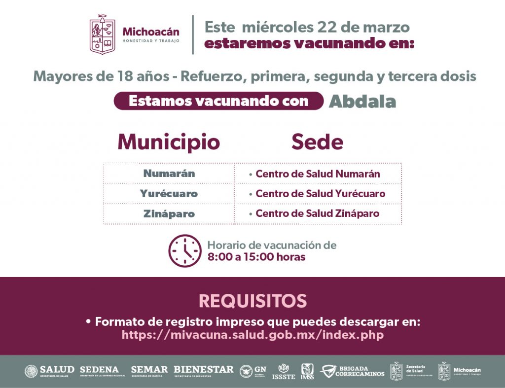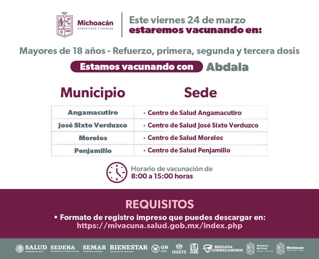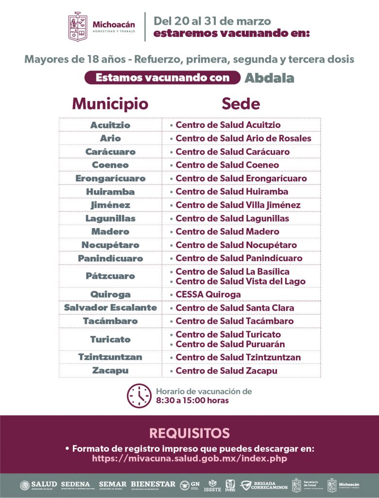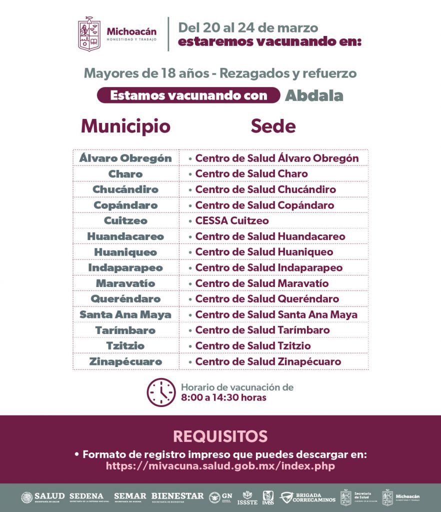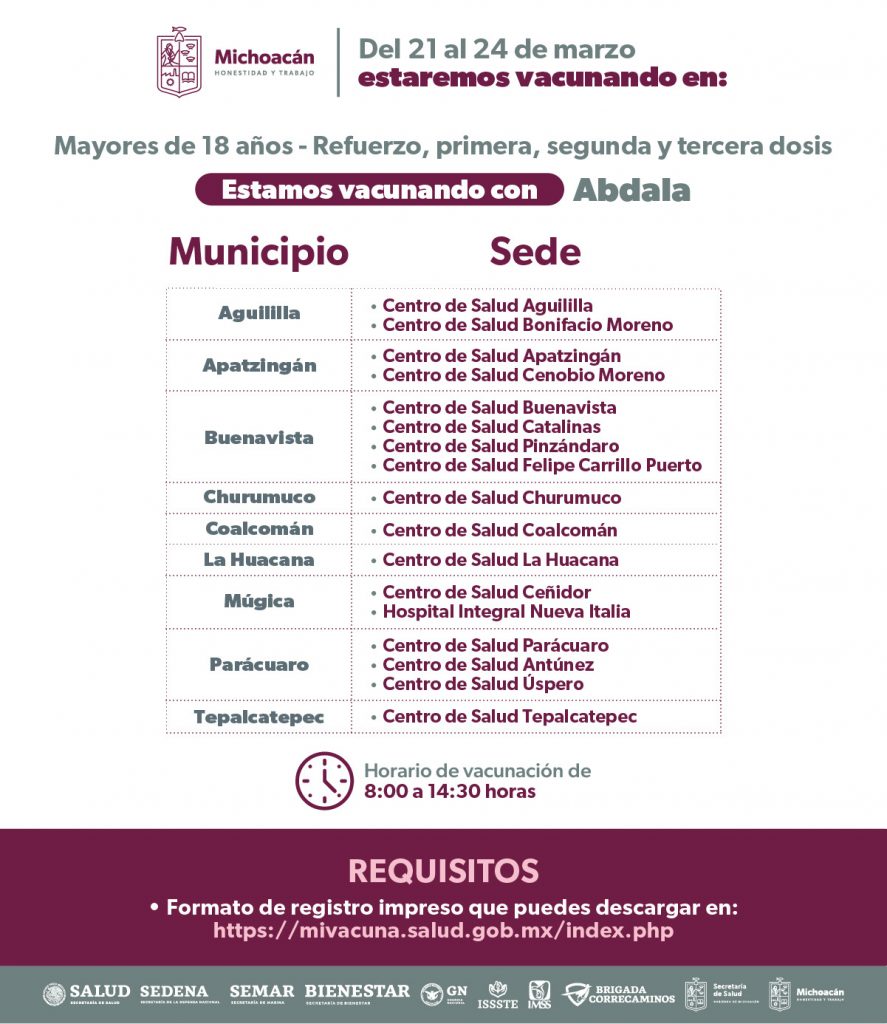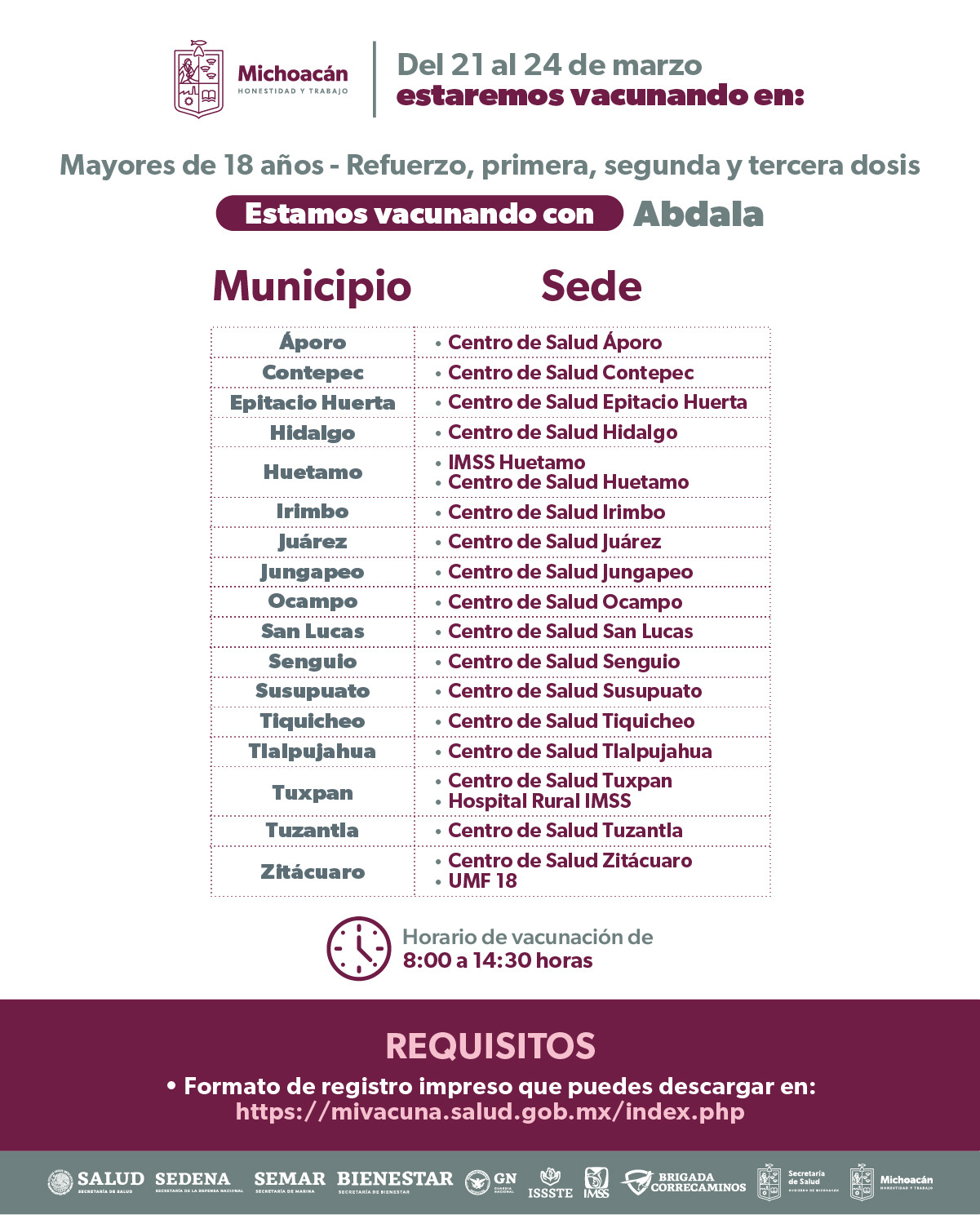 Se instalarán puestos de vacunación en municipios de las ocho jurisdicciones sanitarias como Lázaro Cárdenas, Aporo, Contepec, Epitacio Huerta, Hidalgo, Huetamo, Irimbo, Juárez, Jungapeo, Ocampo, San Lucas, Senguio, Susupuato, Tiquicheo, Tlalpujahua, Tuxpan, Tuzantla, Zitácuaro, Churintzio, Tanhuato, La Piedad, Numarán, Yurécuaro y Zináparo.