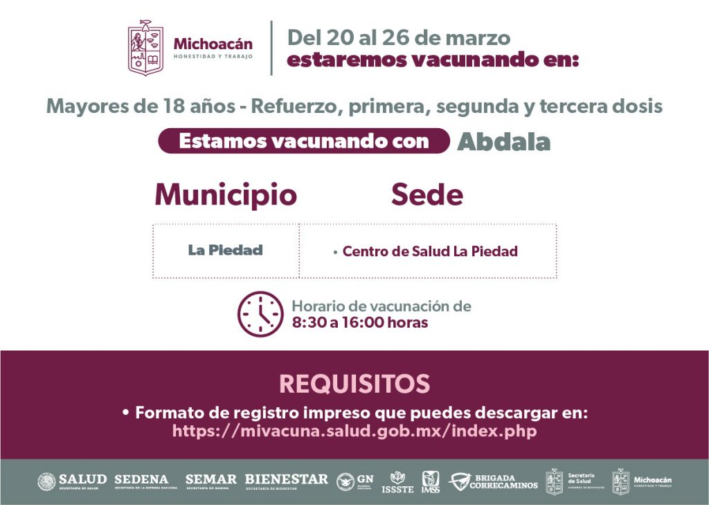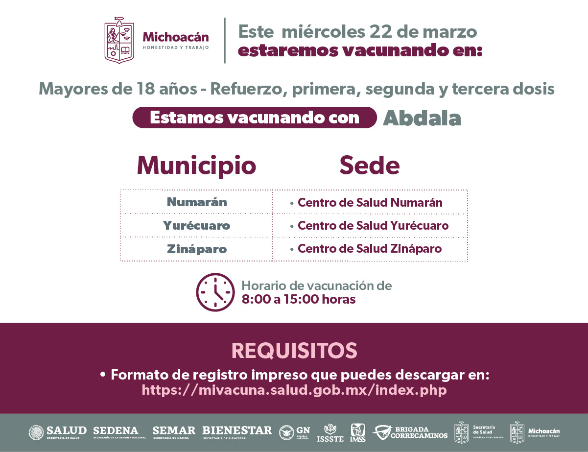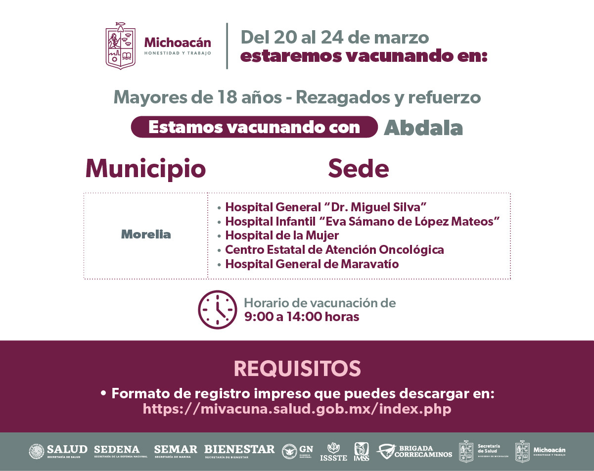 La atención se brindará de 8:00 a 15:00 horas, y los interesados deberán presentarse con su formato de registro impreso, el cual podrán descargar en la página https://mivacuna.salud.gob.mx/index.php.