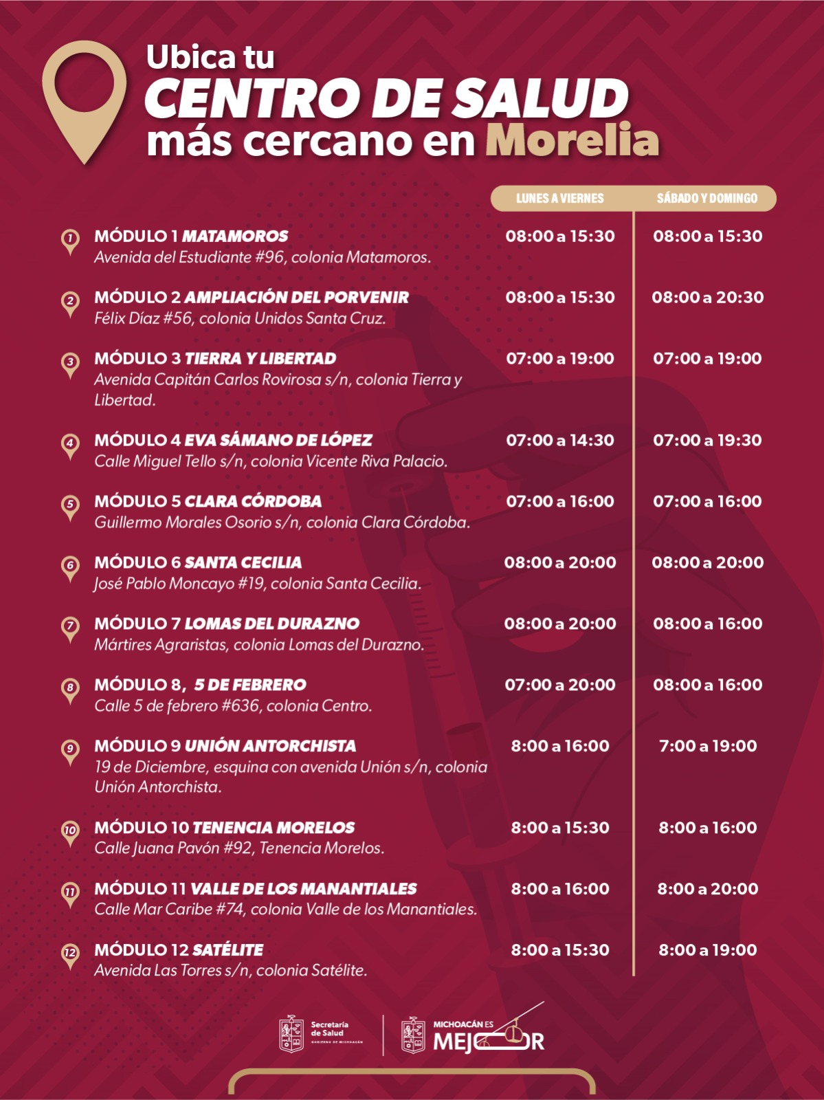 Además, operan las unidades médicas de Unión Antorchista, en San Isidro Itzícuaro; la unidad 5 de Febrero, en el Centro Histórico; y una más en la Tenencia Morelos, ubicada en la calle Juana Pavón 92. A estas se suman los de las colonias Valle de los Manantiales y Satélite.