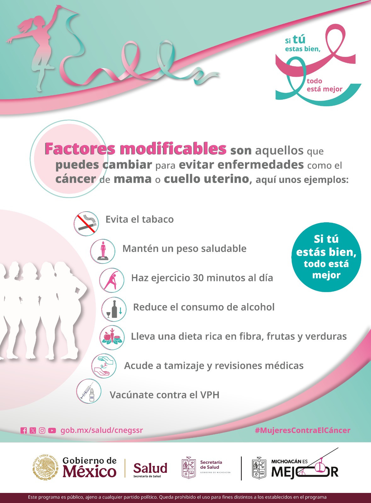 Morelia, Michoacán, 8 de octubre de 2025.- En el marco del Mes de Concientización sobre el Cáncer de Mama, la Secretaría de Salud de Michoacán (SSM) subraya que las mujeres pueden reducir el riesgo de desarrollar esta enfermedad con la adopción de un estilo de vida saludable.