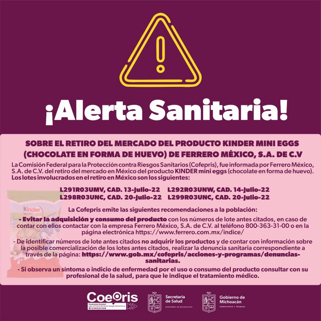 Morelia, Michoacán, a 12 de abril del 2022.-La Comisión Federal para la Protección contra Riesgos Sanitarios (Cofepris), a través de la Secretaría de Salud de Michoacán (SSM), alerta a la población sobre la posible contaminación por salmonella de cuatro lotes del producto “Kinder mini eggs”, los cuales ya fueron retirados a nivel mundial de manera voluntaria por la empresa fabricante.