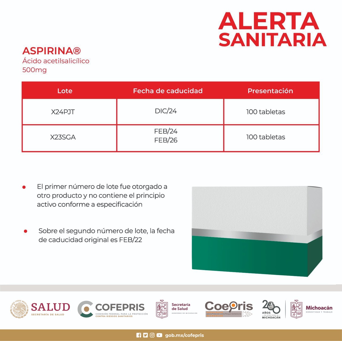 Para el caso de la Aspirina (ácido acetilsalicílico 500 mg): se identificaron dos lotes falsificados de este producto. La presentación de 100 tabletas, con fecha de caducidad DIC/24 y denominación X24PJT, tampoco contiene el principio activo. El segundo lote irregular, X23SGA, muestra dos fechas de caducidad (FEB/24 y FEB/26), mientras que la caducidad original es de FEB/22.