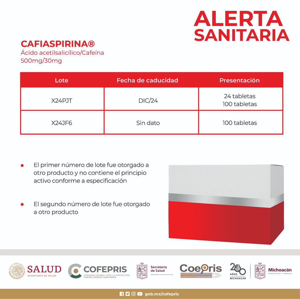 Se trata de Cafiaspirina (ácido acetilsalicílico/cafeína 500 mg/30 mg): cuenta con dos lotes falsificados. Uno es el X24PJT en presentaciones de 24 y 100 tabletas y fecha de caducidad DIC/24. Además, el lote X24JF6, correspondiente a la presentación de 100 tabletas, es ilegal, ya que fue originalmente asignado a otro artículo.