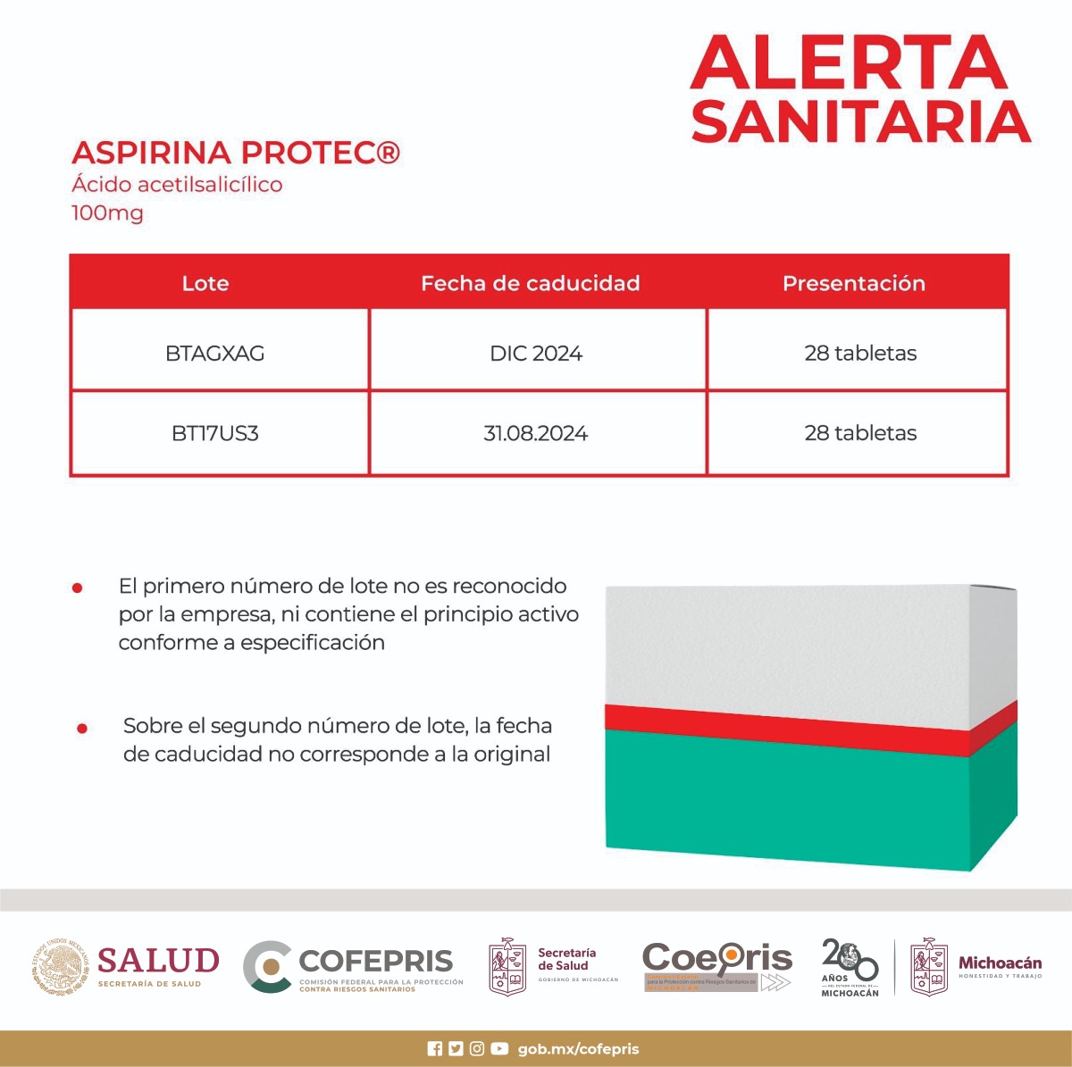 Aspirina Protec (ácido acetilsalicílico 100 mg): Bayer informó que el lote BTAGXAG, con fecha de caducidad DIC 2024 y presentación de 28 tabletas, no contiene el principio activo y su número de lote no es reconocido por la empresa. Asimismo, la presentación de 28 tabletas con lote BT17US3 y fecha de caducidad 31.08.2024 es falsa, ya que la vigencia no corresponde al producto original.
