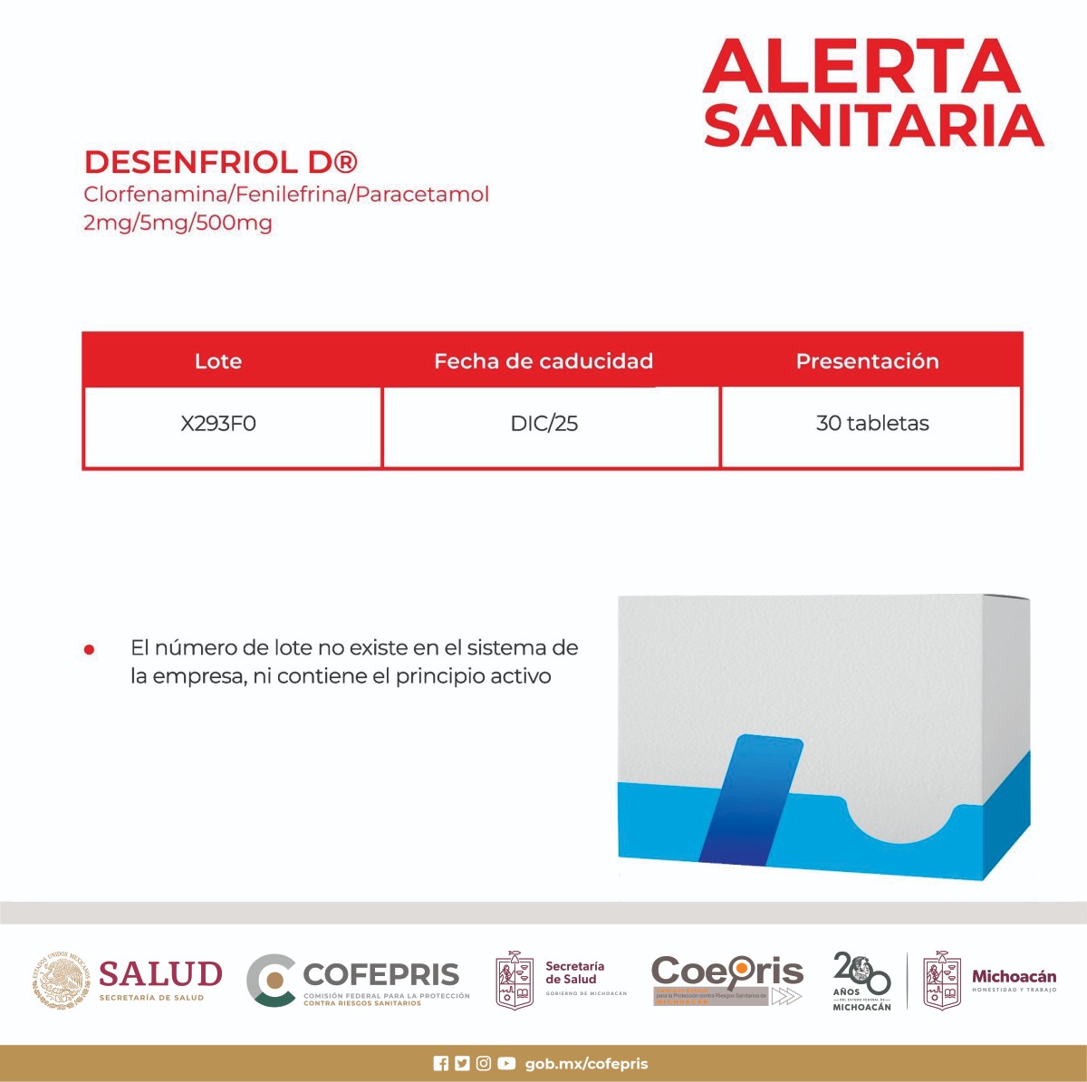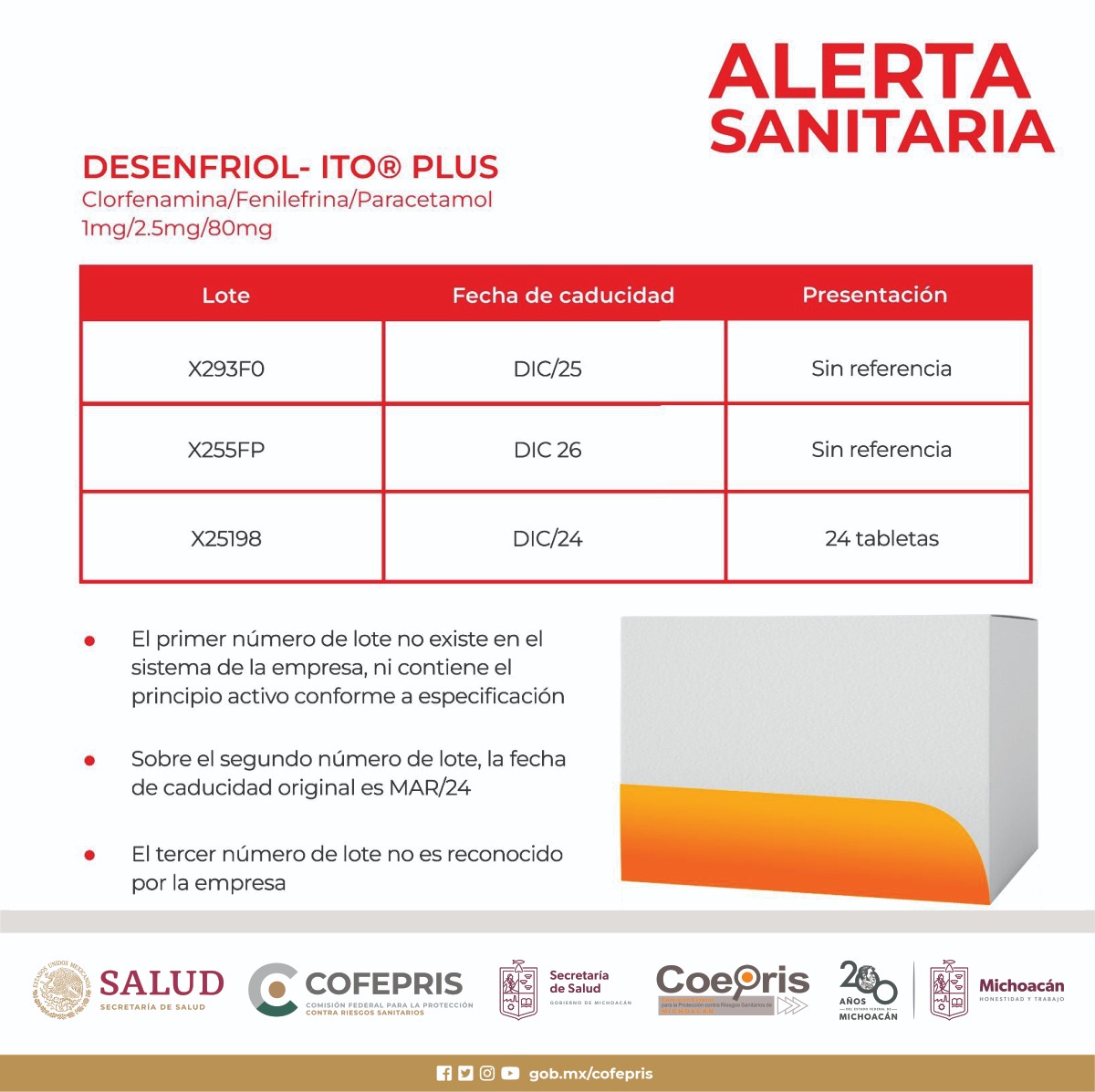 Desenfriol-Ito Plus (clorfenamina/fenilefrina/paracetamol 1 mg/2.5 mg/80 mg): la empresa titular del registro sanitario también informó sobre tres lotes irregulares de este producto. El primero, con el número de lote X293F0 y fecha de caducidad DIC/25, tampoco contiene el principio activo. Además, el lote X25198, con fecha de caducidad DIC/24 en la presentación de 24 tabletas, no es reconocido por la empresa. Por último, se ha confirmado la falsificación del lote X255FP, que muestra caducidad de DIC 26; sin embargo, la fecha original es MAR/24.