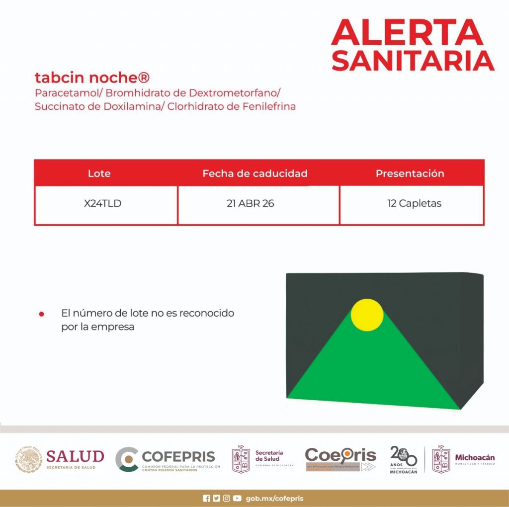 Morelia, Michoacán, 13 de septiembre de 2024.- La Comisión Federal para la Protección contra Riesgos Sanitarios (Cofepris), a través de la Secretaría de Salud de Michoacán (SSM), informa a la población sobre la falsificación de diversos lotes y marcas de medicamentos analgésicos y antigripales, la cual fue notificada por la empresa Bayer de México.
