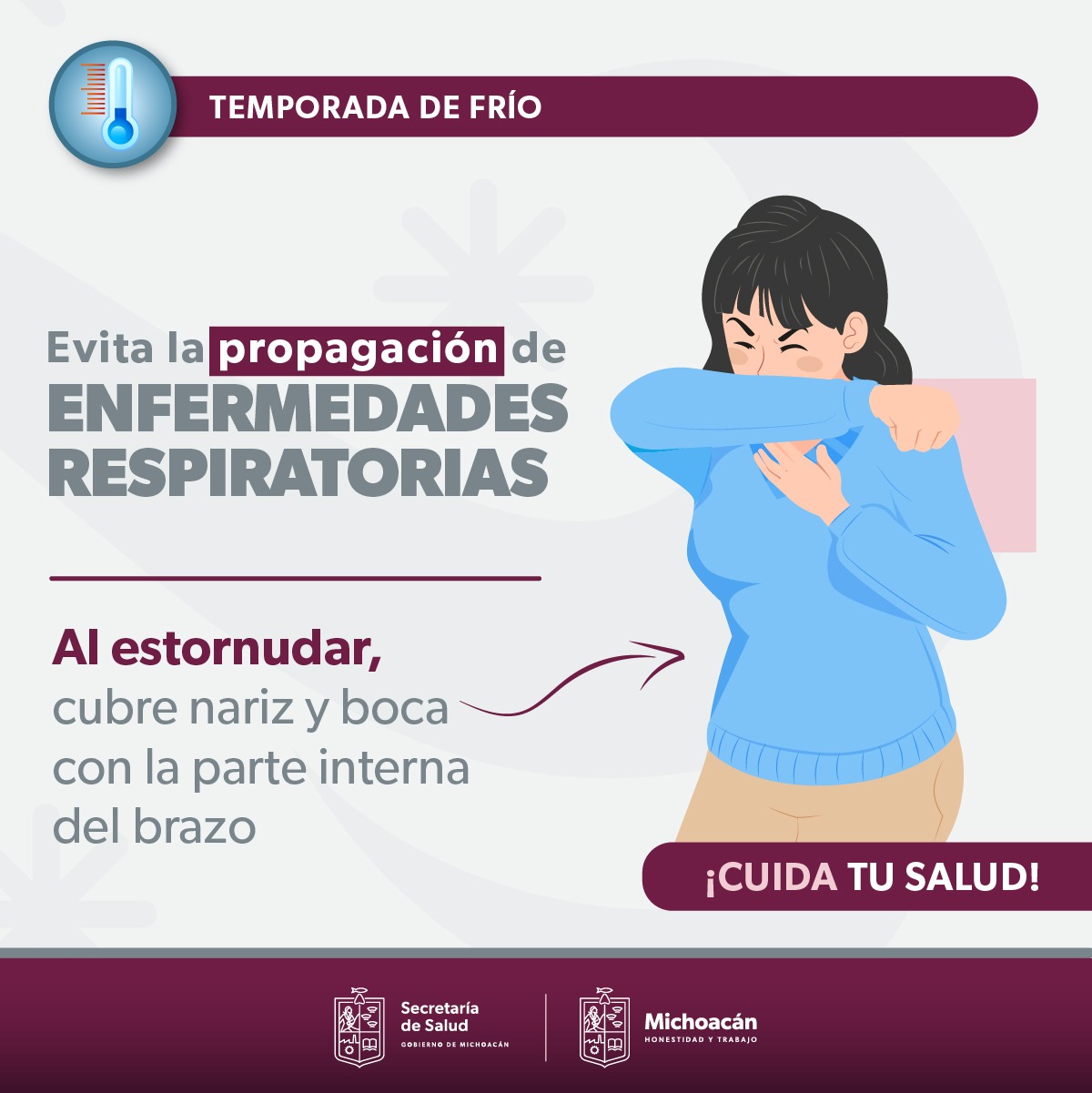 Morelia, Michoacán, a 29 de octubre del 2023.- Derivado de las bajas temperaturas que empiezan a presentarse en la entidad, la Secretaría de Salud en Michoacán (SSM), refuerza las acciones de prevención y promoción en salud; así como la vigilancia epidemiológica, con el propósito de evitar incremento de enfermedades de las vías respiratorias en la población.