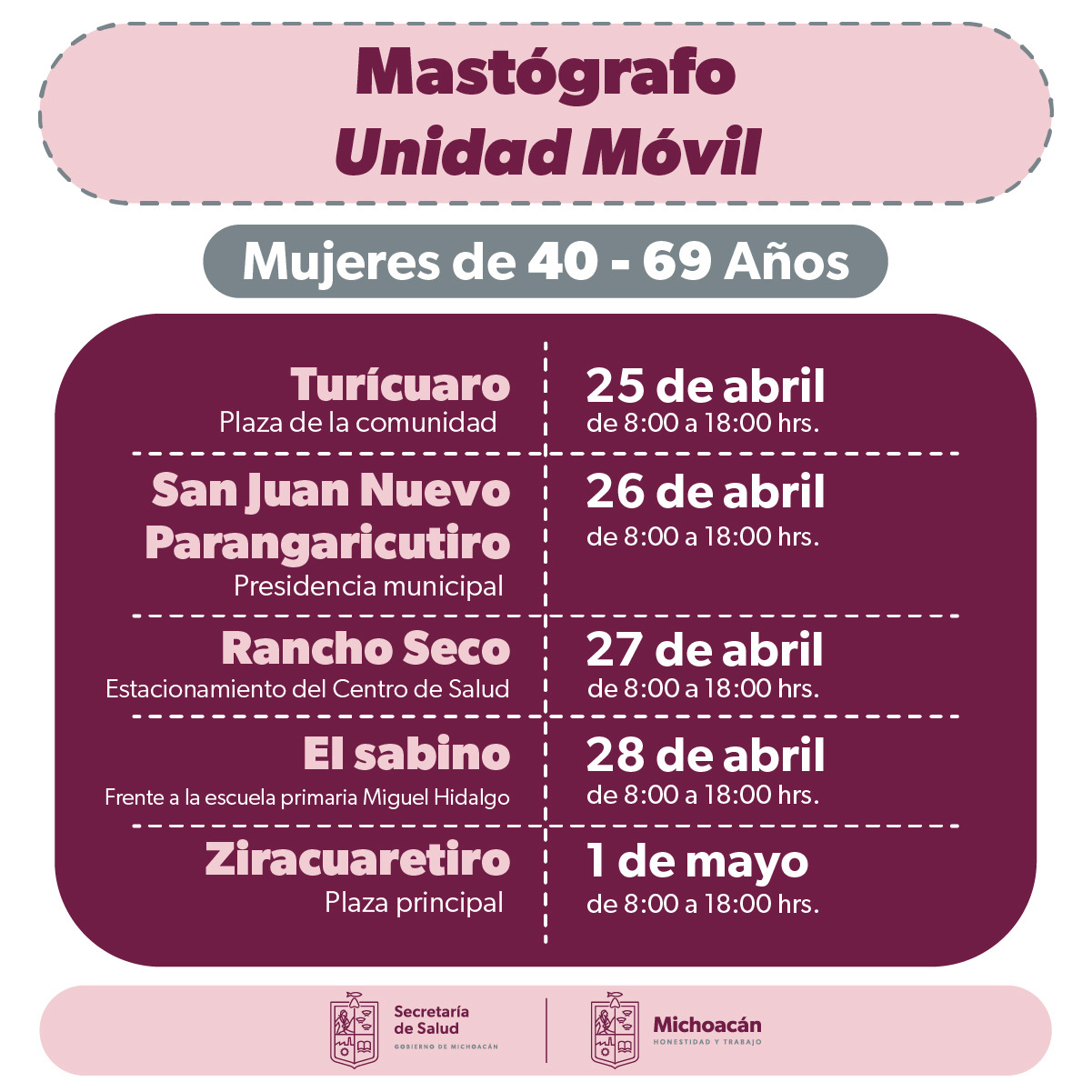 El martes 25 de abril los estudios se realizarán en una unidad móvil que se instalará en la plaza principal de Turícuaro, municipio de Nahuatzen; y el miércoles 26 se atenderá a las mujeres de San Juan Nuevo Parangaricutiro, a un costado de la presidencia municipal.