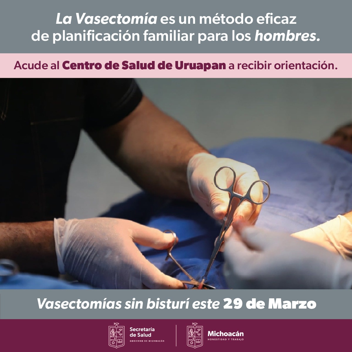 Morelia, Michoacán, 15 de marzo de 2023.- El próximo miércoles 29 de marzo, la Secretaría de Salud de Michoacán (SSM) llevará a cabo una jornada gratuita de vasectomías sin bisturí en el centro de salud de Uruapan Dr. José Álvarez Amezquita.
