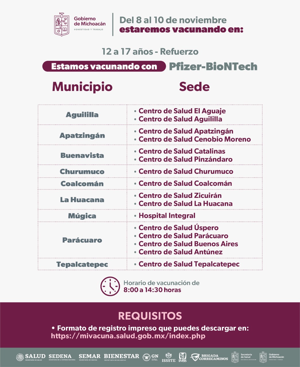 El refuerzo será aplicado del 8 al 10 de noviembre en los municipios de Aguililla, Apatzingán, Buenavista, Churumuco, Coalcomán, La Huacana, Múgica, Parácuaro y Tepalcatepec, en un horario de atención de 8:00 a 14:30 horas y las sedes estarán publicadas en las páginas oficiales de la SSM.