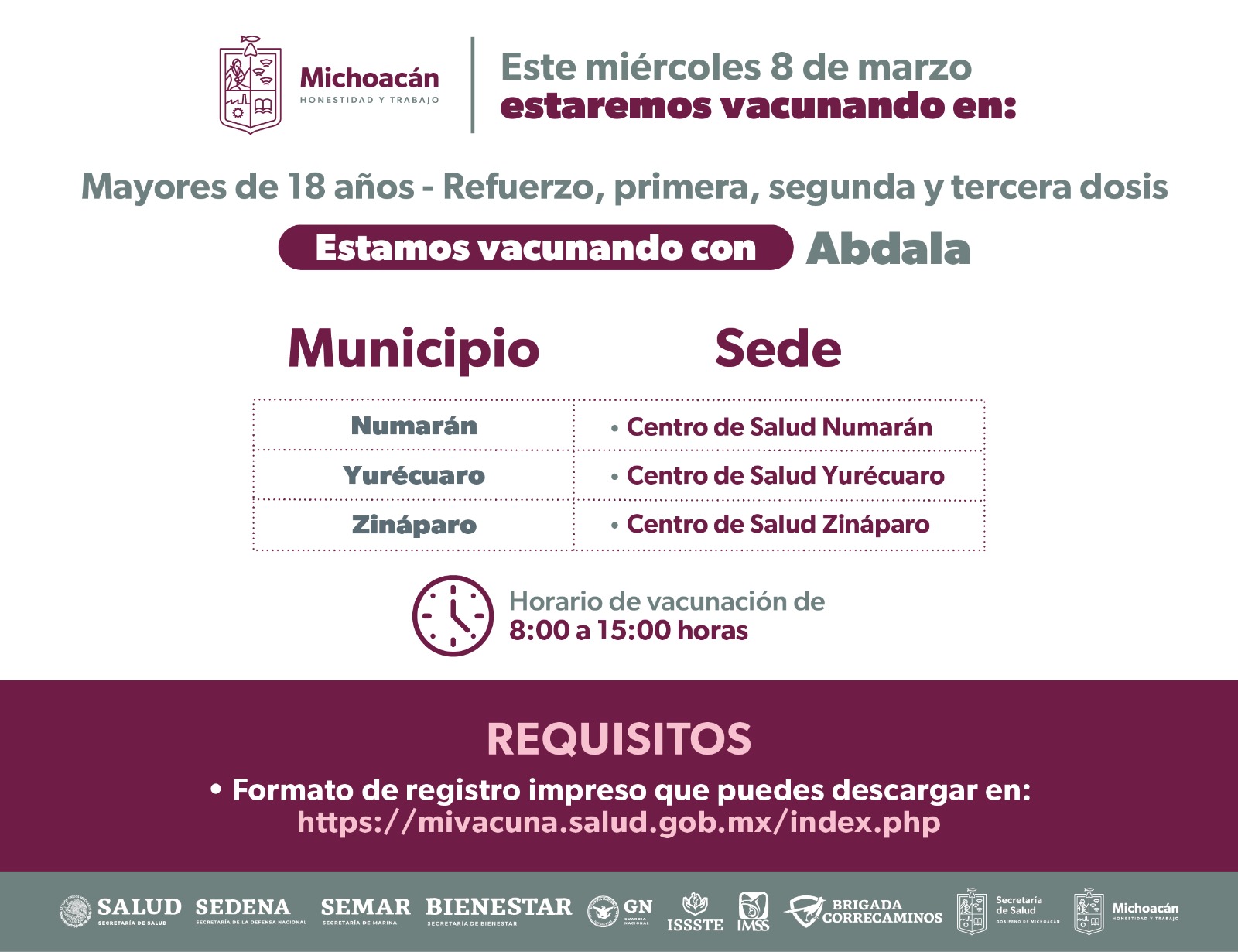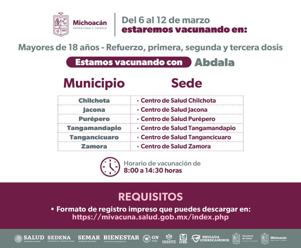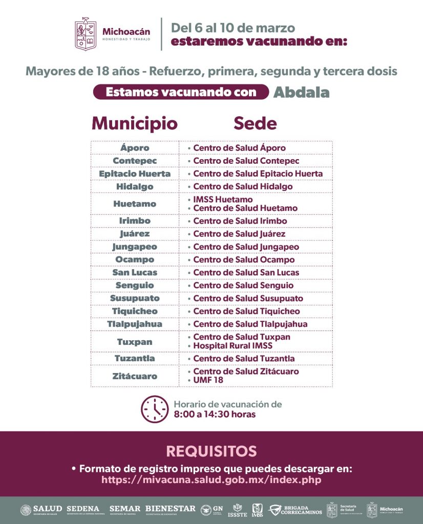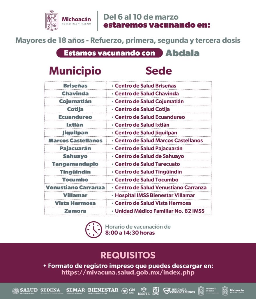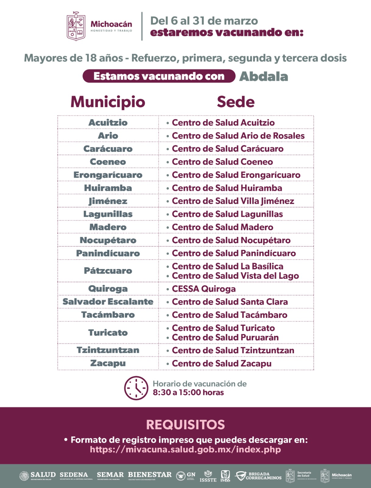 Por ello, el sector salud invita a este grupo poblacional a estar pendientes de cada una de las sedes, las cuales podrán ser consultadas en la cuenta de Facebook de la Secretaría de Salud de Michoacán (SSM).