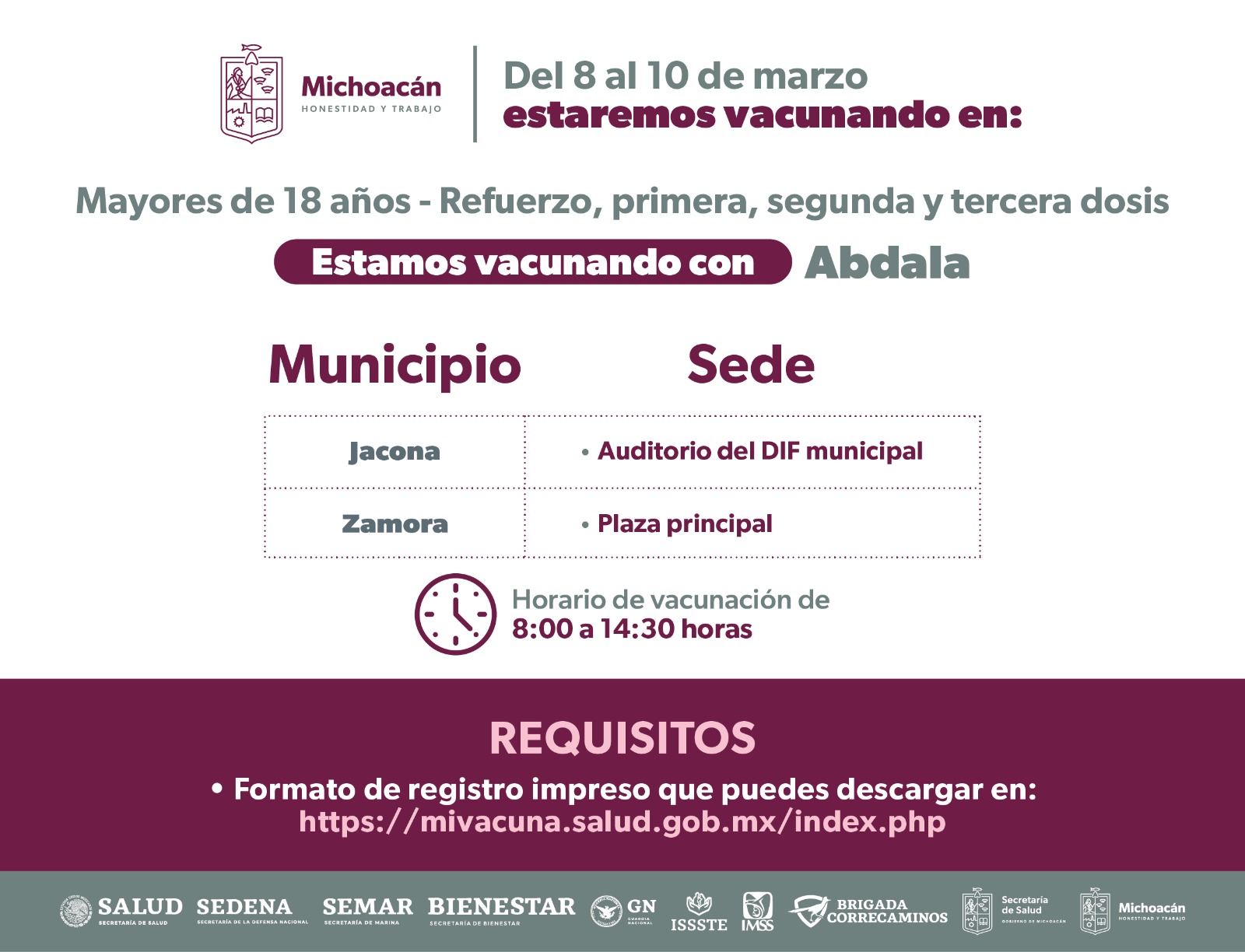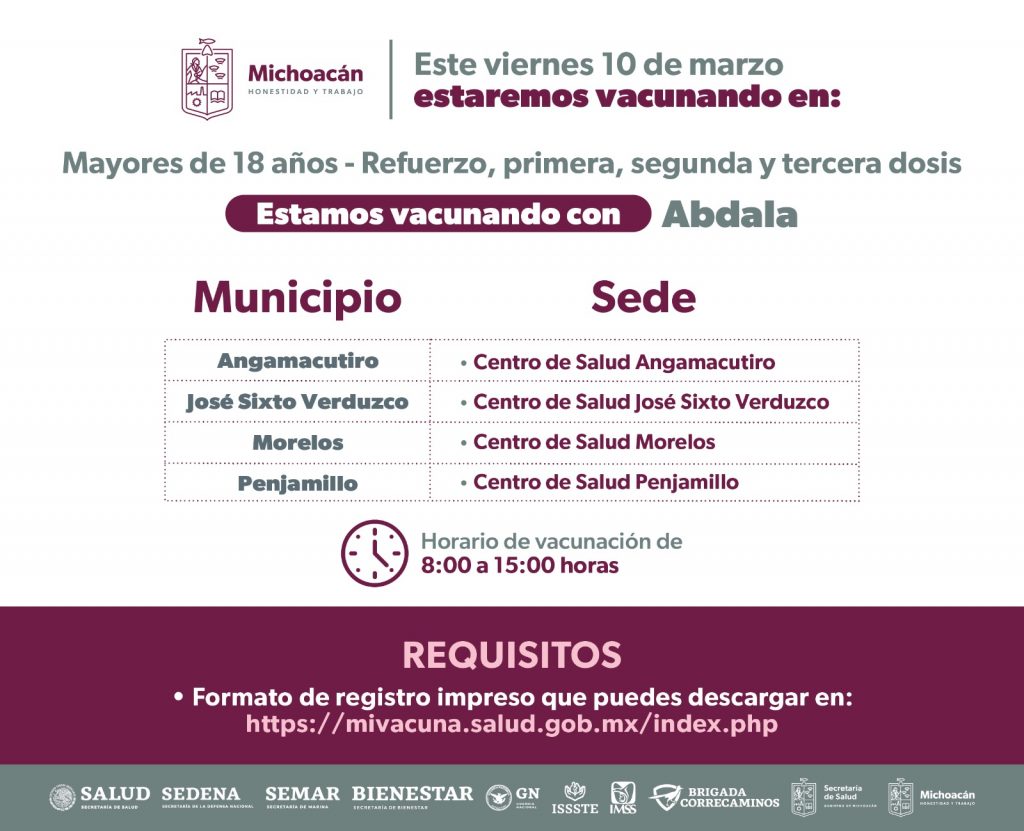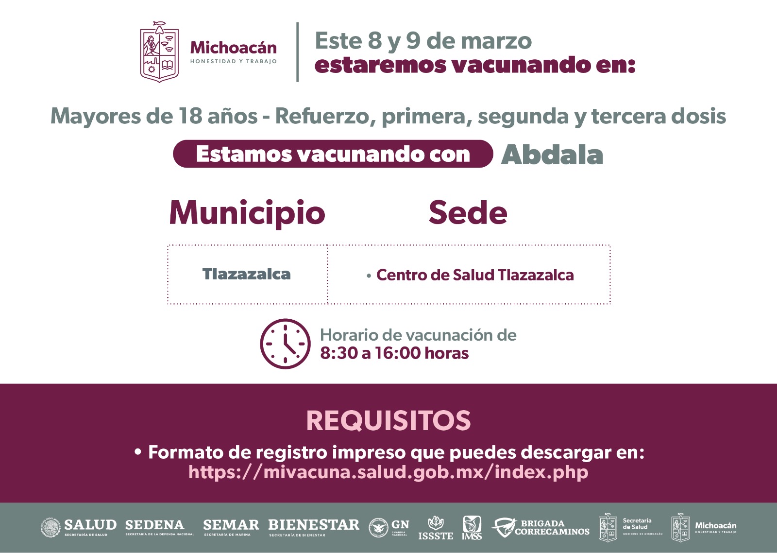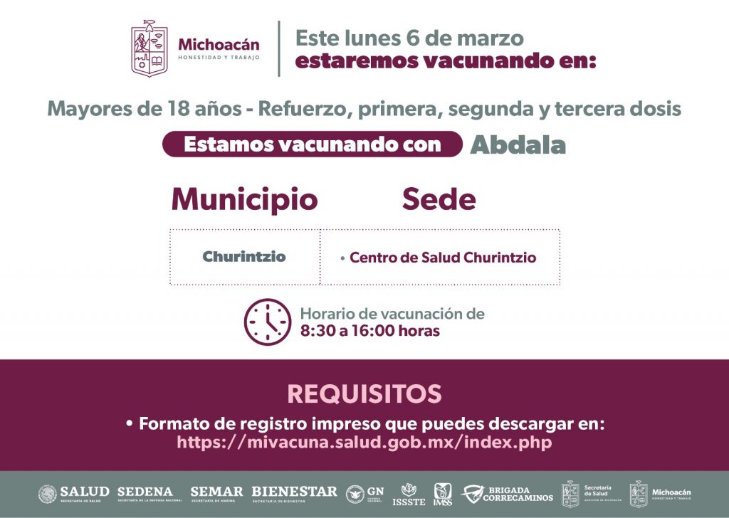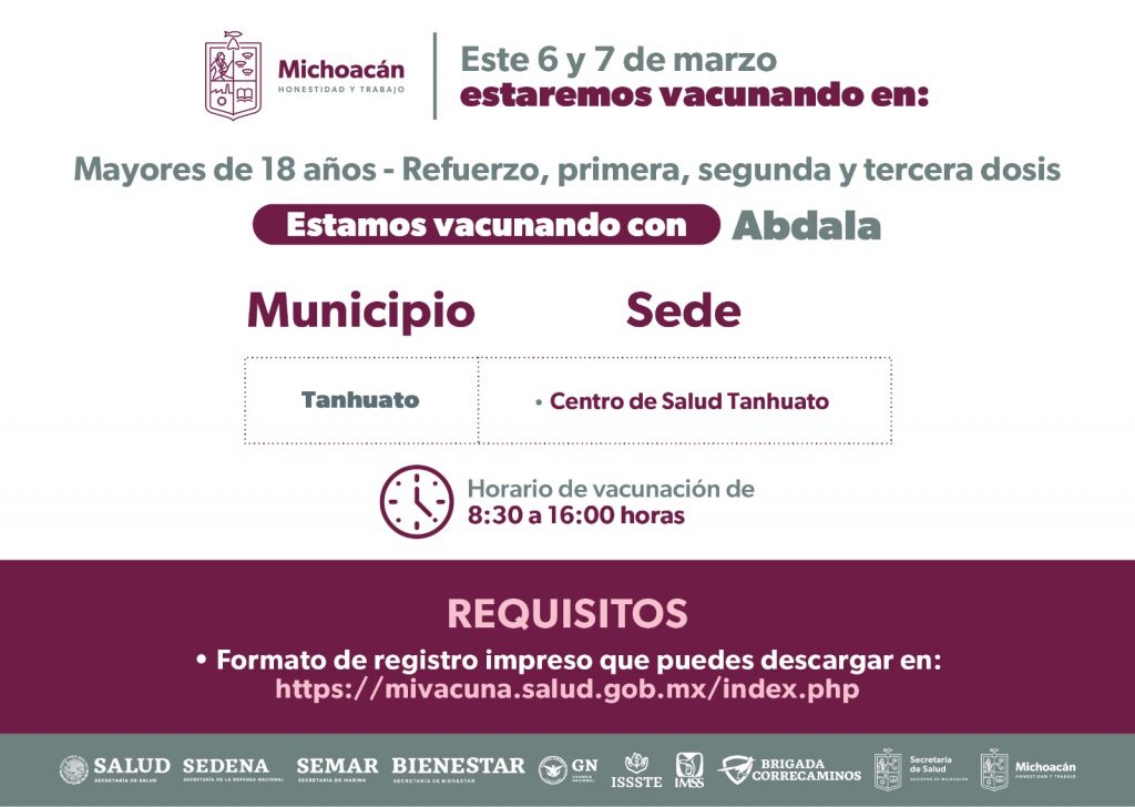 Por ello, el sector salud invita a este grupo poblacional a estar pendientes de cada una de las sedes, las cuales podrán ser consultadas en la cuenta de Facebook de la Secretaría de Salud de Michoacán (SSM).