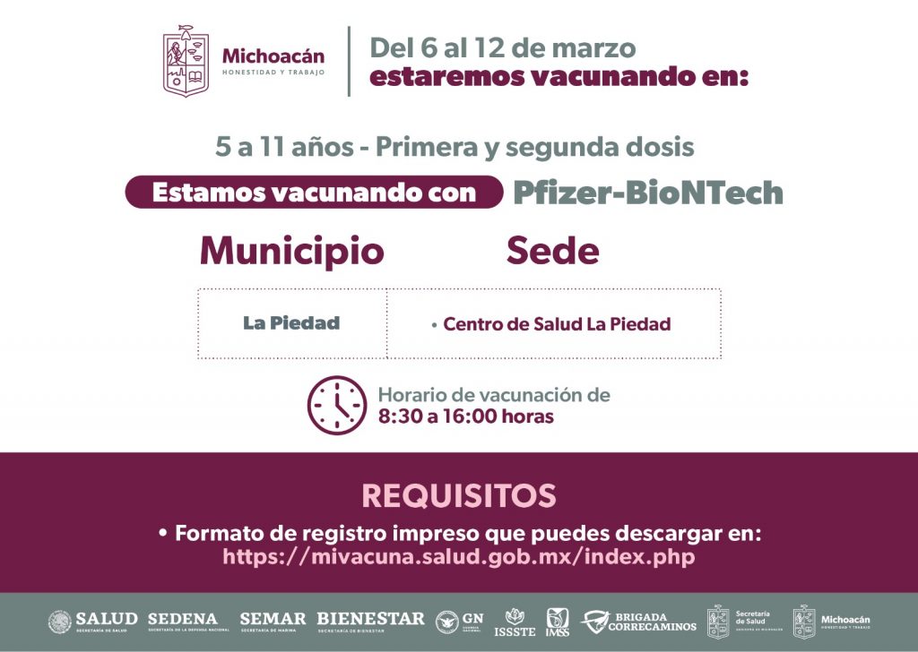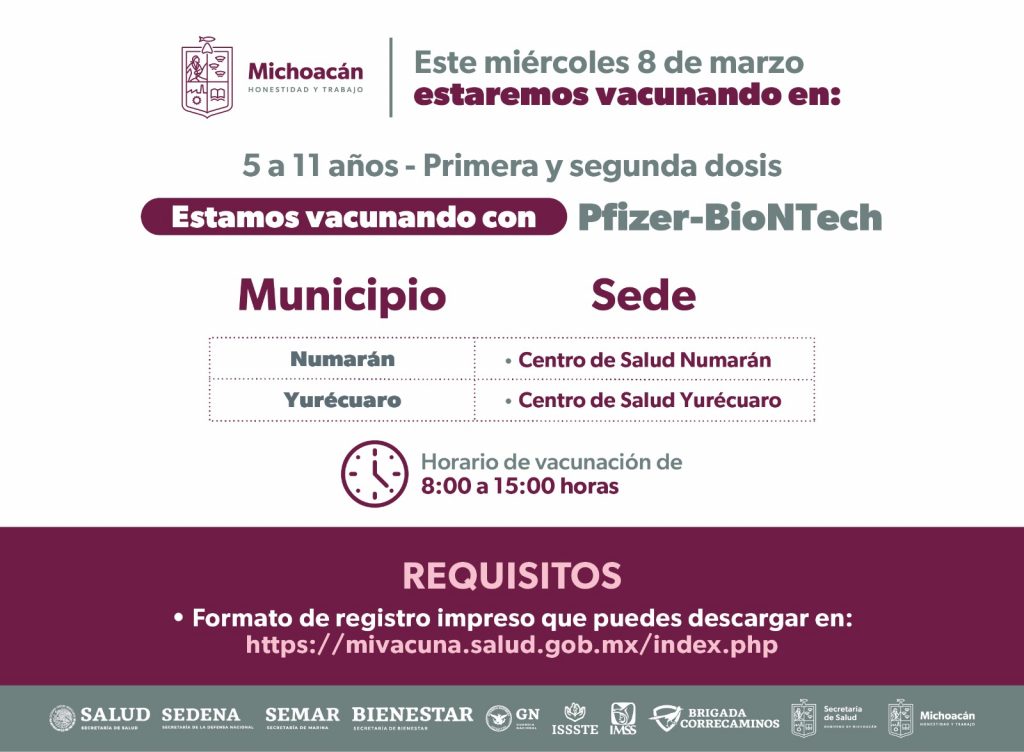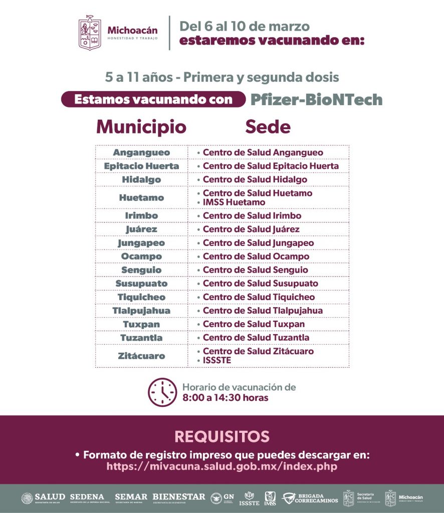 Morelia, Michoacán, 5 de marzo de 2023.- Avanza la vacunación contra el COVID-19 con éxito, es así que del 6 al 12 de marzo el sector salud inmunizará con primeras y segundas dosis a menores de 5 a 11 años, a quienes se les aplica el biológico Pfizer-BioNTech.