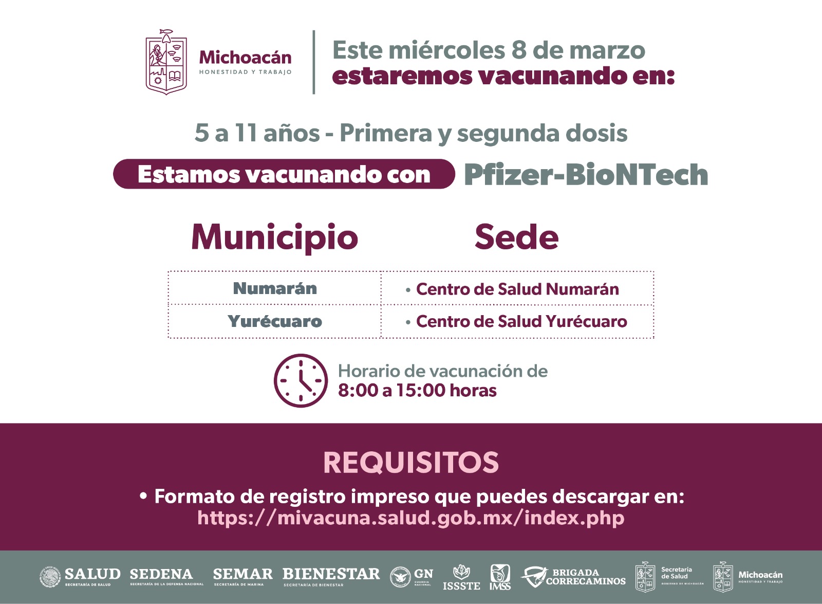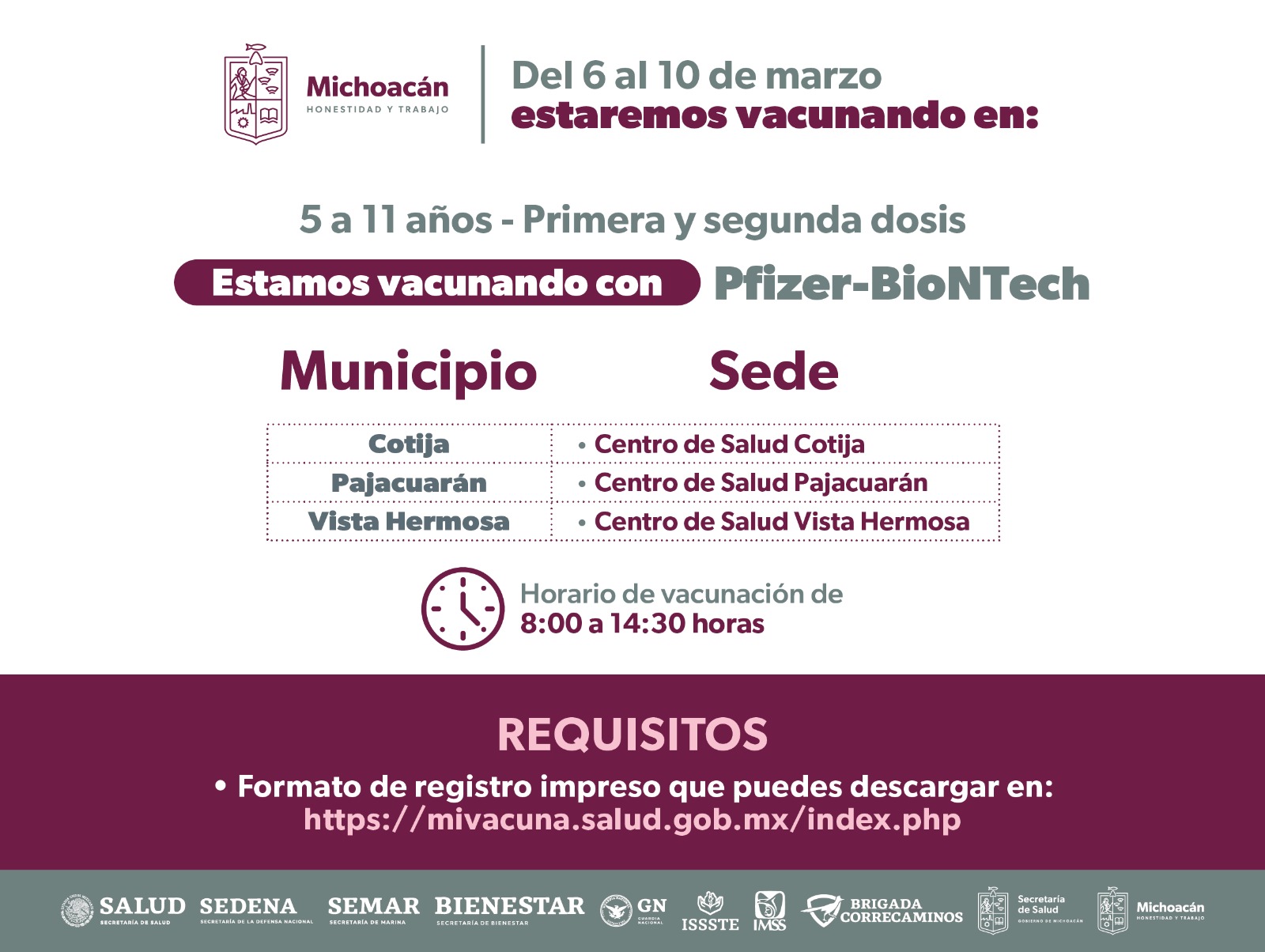 Los interesados deberán acudir en un horario de 8:00 a 14:30 horas con su formato de registro impreso el cual podrán descargar en la página https://mivacuna.salud.gob.mx/index.php.