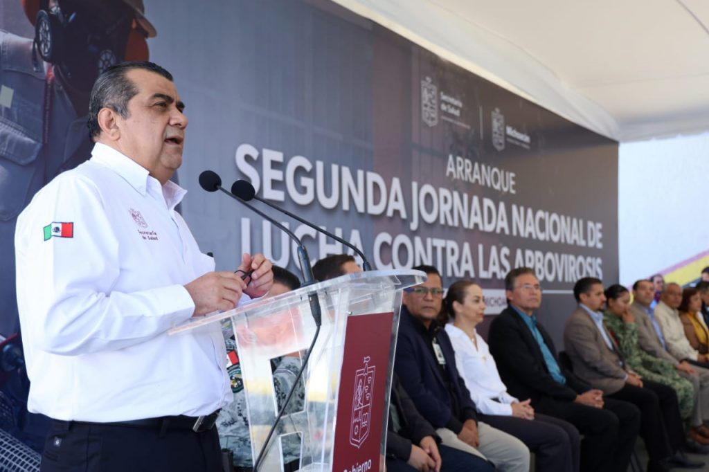 Morelia, Michoacán a 22 de agosto del 2023.- El secretario de Salud de Michoacán, Elías Ibarra Torres, encabezó el banderazo de arranque de la Segunda Semana Nacional de la Lucha contra la Arbovirosis, a fin de contener, mitigar y controlar estas enfermedades que se transmite por mosquitos como el dengue, zika y chikungunya.