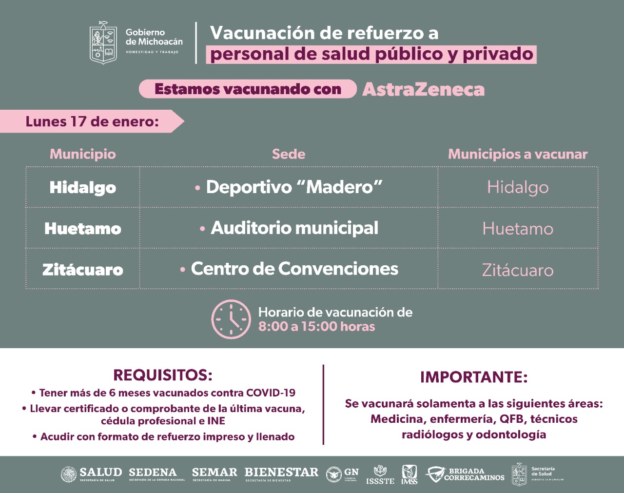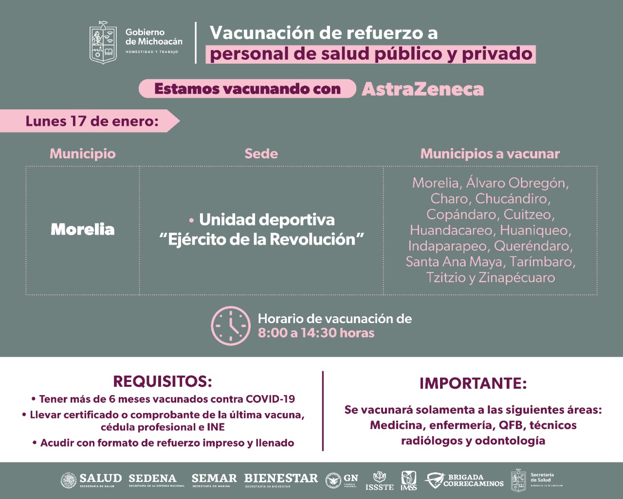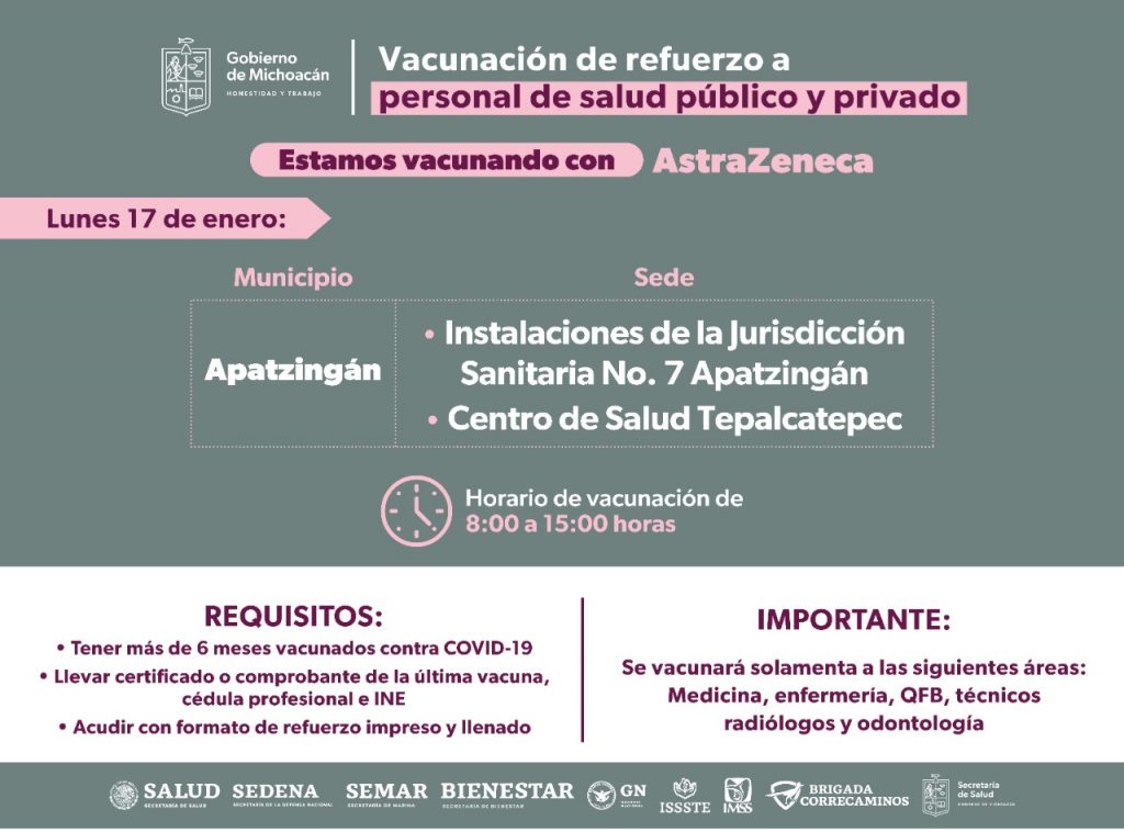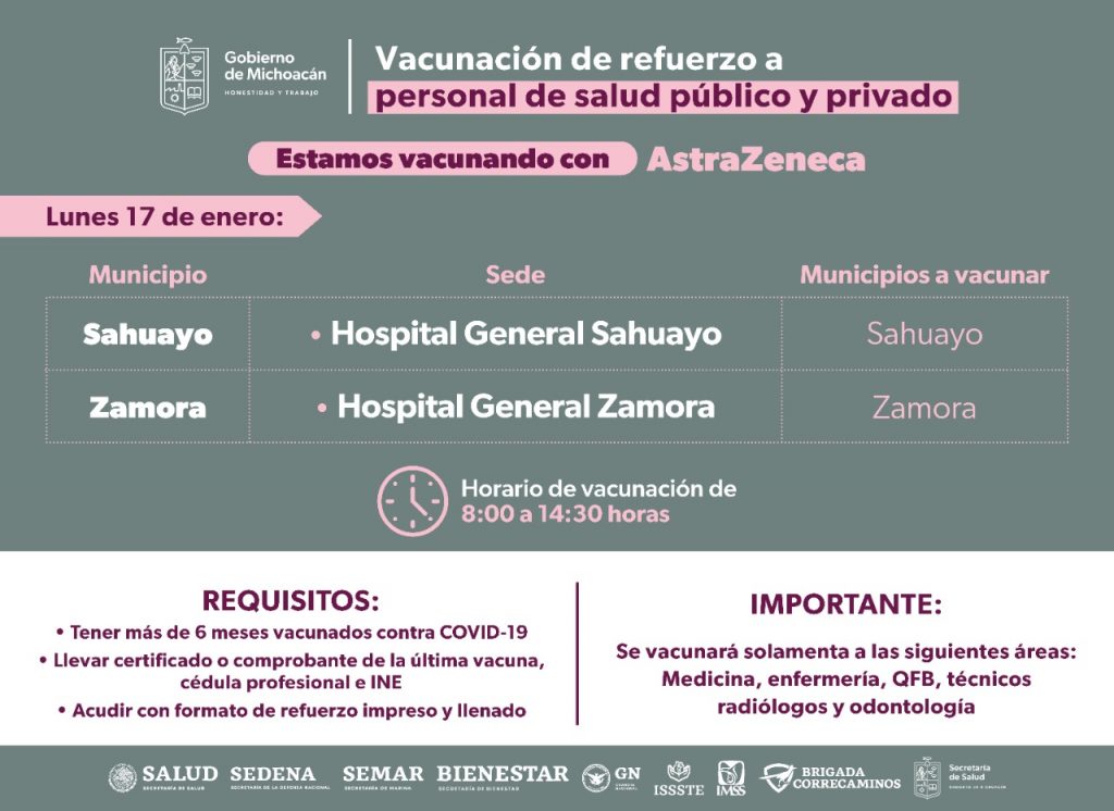 Para ello, hoy lunes 17 se estará vacunando en Morelia (Unidad Deportiva “Ejército de la Revolución); Sahuayo (Hospital General); Zamora (Hospital General) e Hidalgo (Deportivo Madero).
