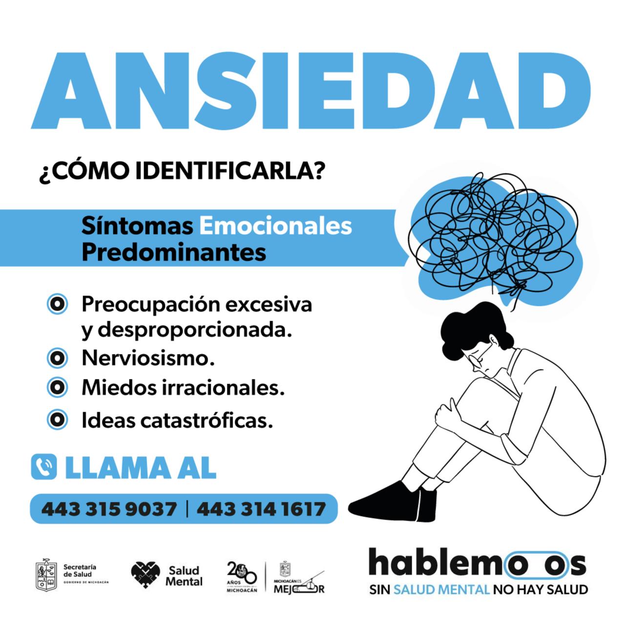 Morelia, Michoacán, a 28 de diciembre de 2024.– La Secretaría de Salud de Michoacán (SSM) te invita a atender a tiempo los problemas de ansiedad, llamando a la línea telefónica Hablemoos, antes de que el problema se convierta en un trastorno de salud mental.