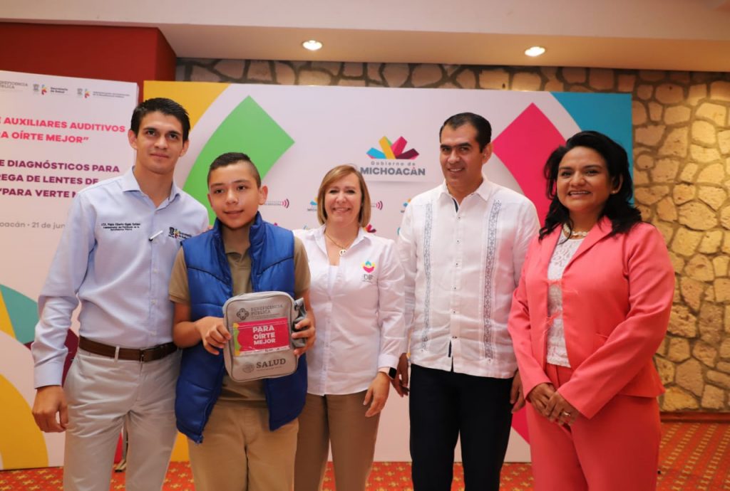 Pablo Alberto Sigala Soriano, director de la Beneficencia Pública de la SSM y Rocío Beamonte Romero, directora de DIF Michoacán, hicieron entrega simbólica de aparatos auditivos y lentes a pacientes de 19 municipios.