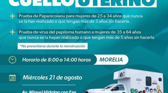 • Del 19 al 23 de agosto, para detectar a tiempo casos de cáncer de cuello uterino Morelia, Michoacán, 19 de agosto de 2024.– La Secretaría de Salud de Michoacán (SSM) invita a todas las mujeres mayores de 25 años a realizarse de manera gratuita un estudio de Papanicolaou y una prueba de detección del […]