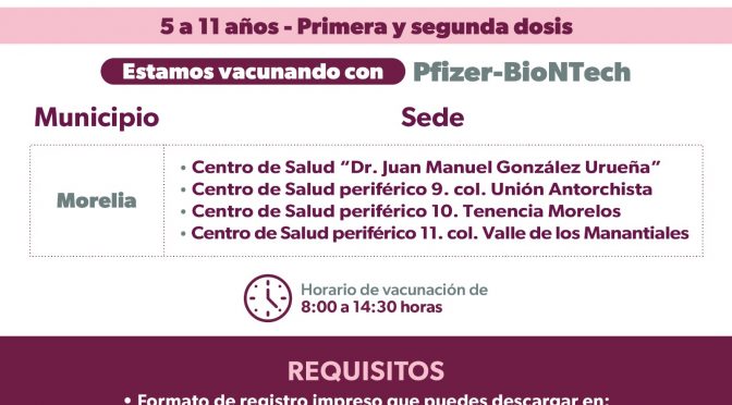 En el módulo ubicado en la plaza del Carmen, de 08:30 a 13:30 horas Morelia, Michoacán, 5 de septiembre de 2023.- Del 5 al 8 de septiembre, la Secretaría de Salud de Michoacán (SSM) aplicará primeras y segundas dosis de la vacuna Pfizer contra el COVID-19 a niñas y niños de cinco a 11 años […]