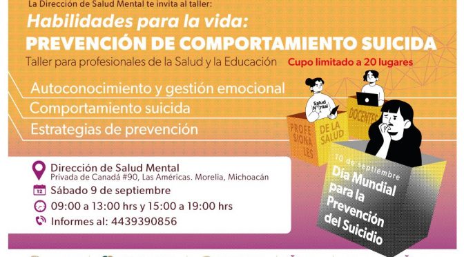 El próximo sábado 9 de septiembre, con inscripción gratuita Morelia, Michoacán, 6 de septiembre de 2023.- En el marco del Día Mundial para la Prevención del Suicidio, la Secretaría de Salud de Michoacán (SSM), a través de la Dirección de Salud Mental, realizará el próximo sábado 9 de septiembre un taller de habilidades para la […]