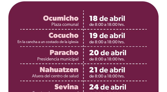 La SSM instala módulos itinerantes en 4 colonias. Uruapan, Michoacán, 18 de abril de 2023.- La Secretaría de Salud de Michoacán (SSM) continúa con la vacunación gratuita a través de módulos itinerantes instalados este martes en distintas zonas de Uruapan, donde se aplican biológicos a menores de cinco años y a niñas de hasta 14. […]