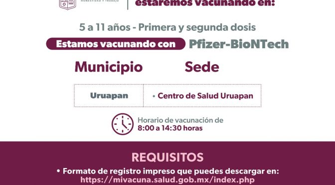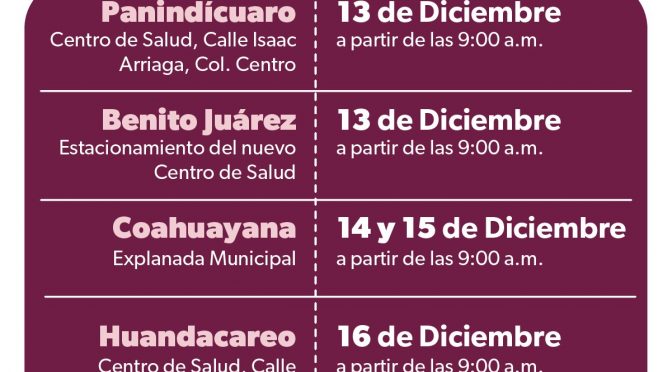 Del 13 al 16 de diciembre se vacunará en el centro de salud Morelia, Michoacán, 12 de diciembre del 2022.- Todos los rezagados, de 5 a 11 años que requieran la segunda dosis de Pfizer serán inmunizados en Uruapan, del 13 al 16 de diciembre. Las niñas y niños con 5 a 11 años cumplidos […]