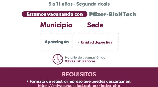 Morelia, Michoacán, 5 de diciembre del 2022.- Del 5 al 6 de noviembre, la Secretaría de Salud de Michoacán (SSM) aplicará segundas dosis de la vacuna anti COVID-19 a niños de entre 5 a 11 años en Apatzingán. La sede de la inmunización será la unidad deportiva de Apatzingán, con horario de 09:00 a 14:30 […]