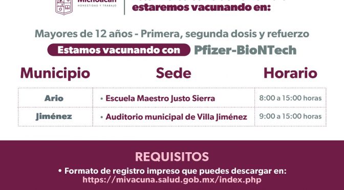Morelia, Michoacán, 24 de noviembre del 2022.- En Zitácuaro, todos los mayores de 18 años que aún no cuenten con la segunda dosis de Pfizer o el refuerzo de la misma marca, podrán solicitarlo este 24 y 25 de noviembre, por lo que la Secretaría de Salud de Michoacán (SSM) exhorta a la población a […]