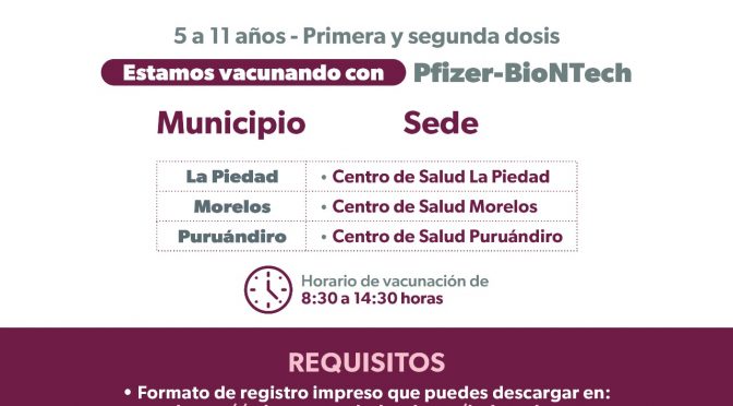 Del 22 al 25 de noviembre serán aplicadas primeras y segundas dosis de Pfizer para este grupo poblacional Morelia, Michoacán, 22 de noviembre del 2022.- Del 22 al 25 de noviembre continuará, en Michoacán, la vacunación contra el COVID-19 para niñas y niños de 5 a 11 años de edad, pues el Plan Nacional de […]