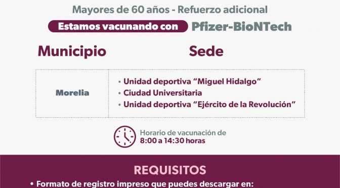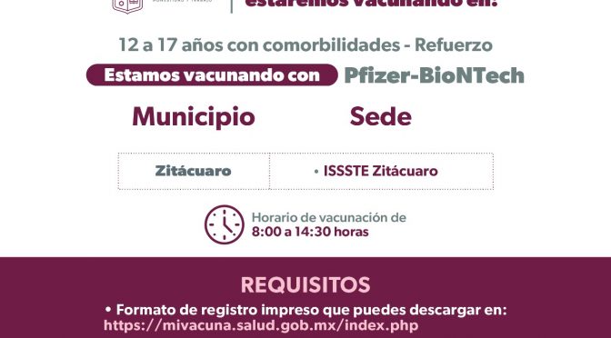 Morelia, Michoacán, 10 de noviembre del 2022.- Del 10 al 11 de noviembre, la Secretaría de Salud de Michoacán (SSM) aplicará segundas dosis y refuerzos de la vacuna anti COVID-19 a los adolescentes de 12 a 17 años, en 28 municipios del estado. En Hidalgo, Ocampo, Tiquicheo y Ecuandureo, la inmunización será en los centros […]