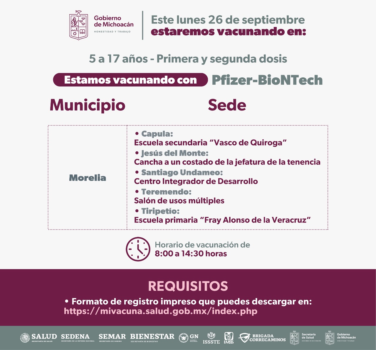Será un único día Se trata de Capula, Jesús del Monte, Santiago Undameo, Teremendo y Tiripetío donde se aplicarán primeras y segundas dosis de Pfizer Morelia, Michoacán, 23 de septiembre del 2022.- Para dar cumplimiento al Plan Nacional de Salud, el próximo lunes 26 de septiembre serán vacunados, contra el COVID-19, todos los niños de […]