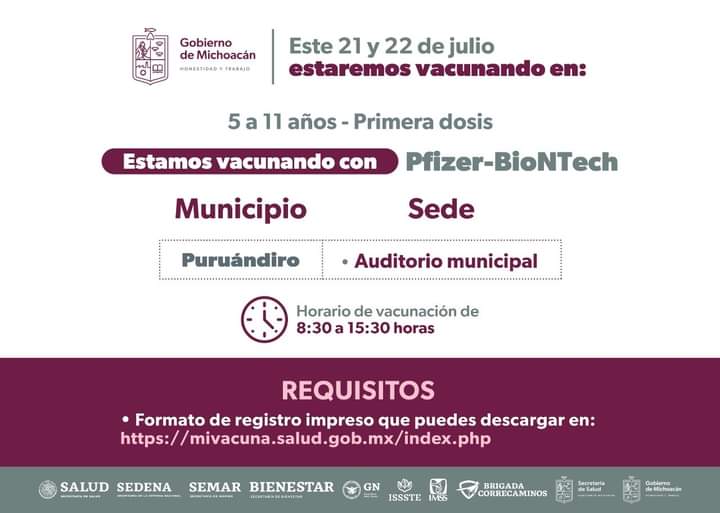 Morelia, Michoacán, 22 de julio del 2022.- Este viernes 22 de julio, continúa la vacunación anti Covid-19 a los niños de entre 5 a 11 años de edad, en el interior de Michoacán, con módulos instalados en los municipios de Hidalgo, Huetamo, Puruándiro, Tacámbaro y Zacapu. Las sedes para la inmunización en Puruándiro, Tacámbaro, Zacapu […]