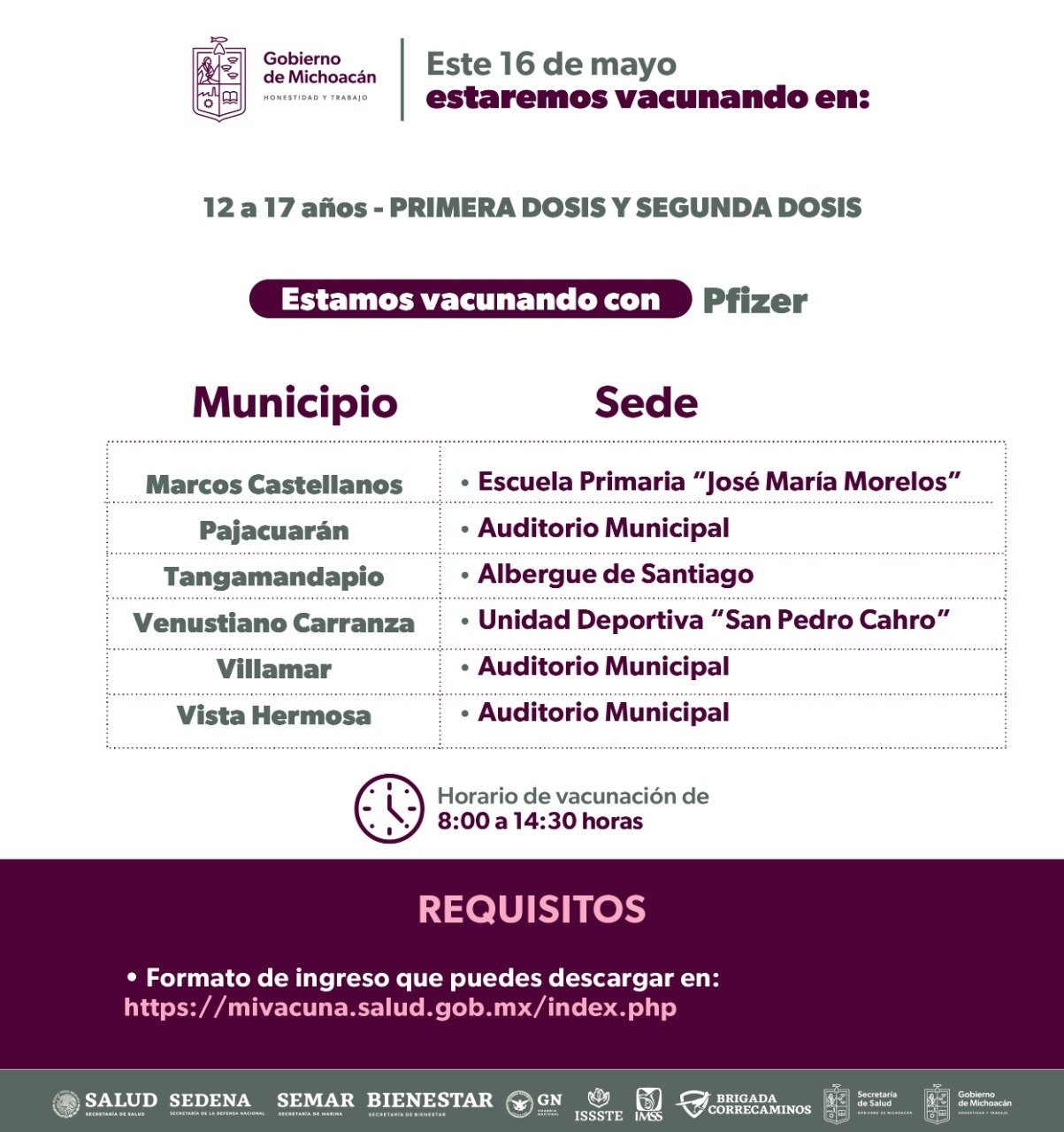 Morelia, Michoacán a 14 de mayo del 2022.-Este sábado 14 de mayo, el Gobierno de Michoacán continúa con la vacunación contra el Covid-19, para los adolescentes de 12 a 14 años en 10 municipios del estado, por lo que la Secretaría de Salud de Michoacán (SSM) los exhorta a inmunizarse. Se trata de los municipios […]