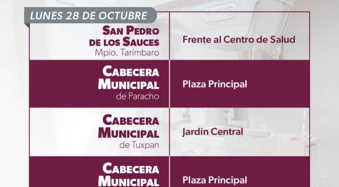 Morelia, Michoacán, 27 de octubre de 2024.- La Secretaría de Salud de Michoacán (SSM) cierra el mes de octubre con mastografías gratuitas en 10 municipios a través de sus cuatro unidades móviles. Por ello, invita a las mujeres de 40 a 69 años de edad, estar pendientes y consultar en la página de Facebook de […]