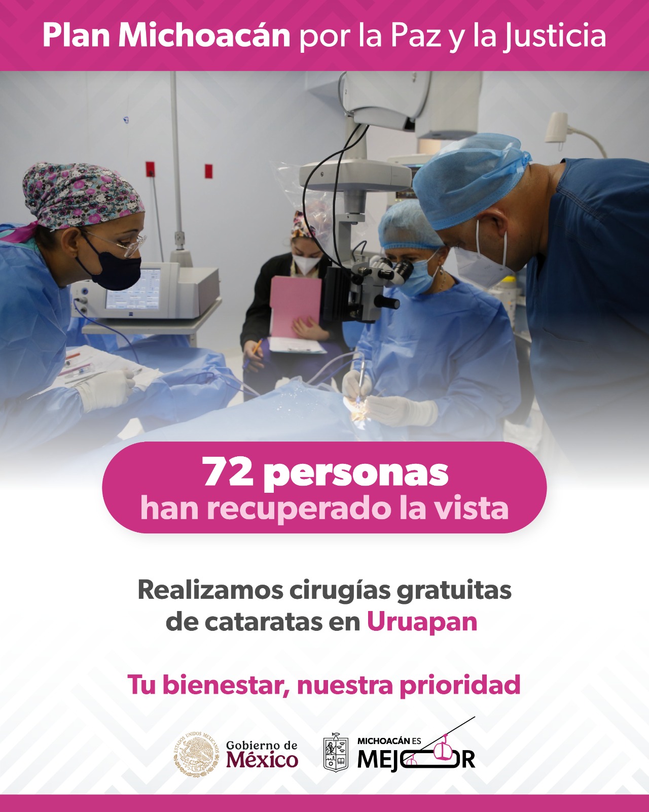 Morelia, Michoacán, 13 de diciembre de 2025.- Como parte de las acciones del Plan Michoacán por la Paz y la Justicia, la Secretaría de Salud (SSM) logró que 72 habitantes de Uruapan recuperaran la vista a través de la jornada gratuita de cirugías de cataratas, realizada en el municipio, mejorando significativamente su calidad de vida