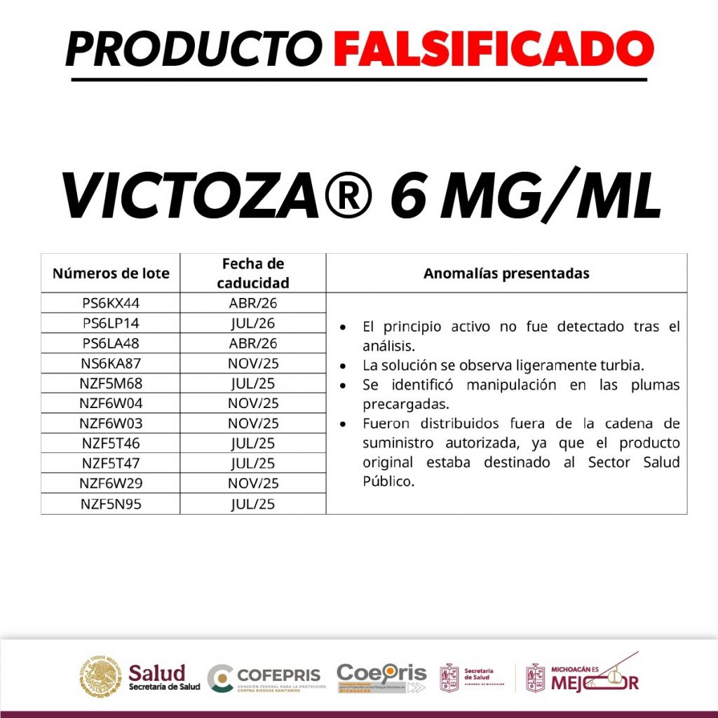 Por ello, se recomienda a la población no adquirir ni utilizar Victoza®️ con características sospechosas o de procedencia desconocida. Verificar siempre el empaque, número de lote y fecha de caducidad antes de su uso. Evitar la compra de medicamentos a través de redes sociales o establecimientos no autorizados y en caso de detectar este producto, realizar la denuncia sanitaria correspondiente al correo: denuncias.coepris@salud.michoacan.gob.mx