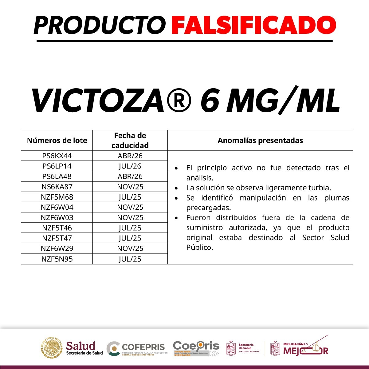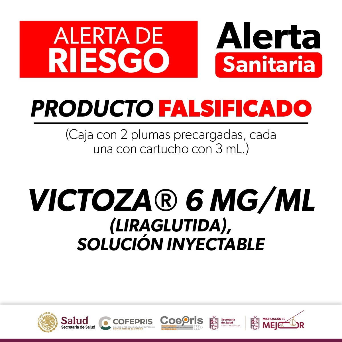 Morelia, Michoacán, 18 de marzo de 2026.- La Comisión Federal para la Protección contra Riesgos Sanitarios (Cofepris), a través de la Secretaría de Salud de Michoacán (SSM), informa a la población sobre la alerta sanitaria emitida respecto a la falsificación del medicamento Victoza®️ 6 mg/mL (Liraglutida), solución inyectable en pluma precargada, usado para mejorar el control glucémico.