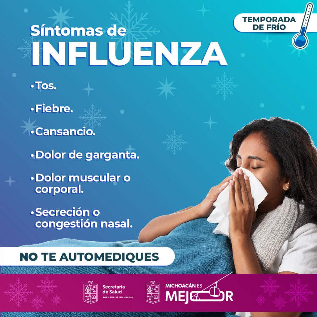 Morelia, Michoacán, 25 de diciembre de 2024.- Si presentas síntomas repentinos de fiebre, cansancio, dolor de garganta, dolor de cabeza, tos o dolores musculares y congestión nasal, pueden ser signos de influencia.