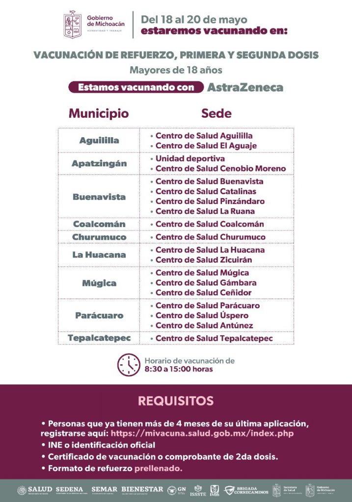 Los puestos de vacunación estarán operando de 8:00 a 15:00 horas en Aguililla (Centro de Salud Aguililla y el Aguaje); Apatzingán (unidad deportiva y Centro de Salud Cenobio Moreno); Buenavista (Centros de Salud de Buenavista, Catalina, Pinzándaro y La Ruana) y Coalcomán (centro de Salud Coalcomán).