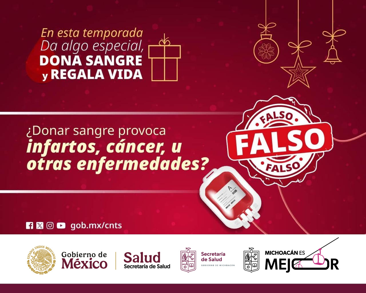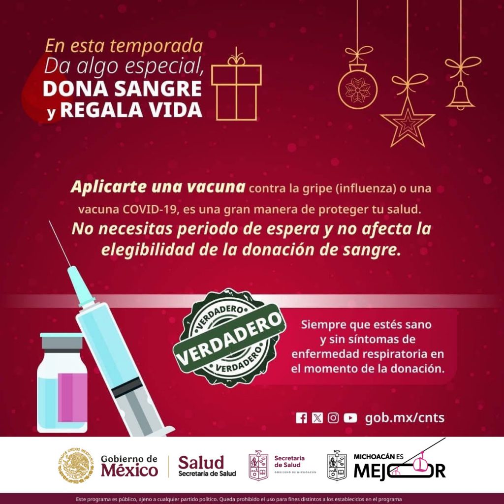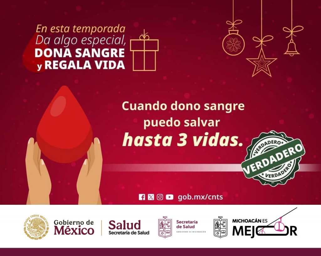 Durante la época de fiestas decembrinas, las reservas en los hospitales disminuyen considerablemente, ya que los tratamientos continúan e incrementan accidentes y cirugías, por ello, se invita a las y los michoacanos a realizar donación de sangre voluntaria y altruista en beneficio de personas que luchan por su salud y su vida.