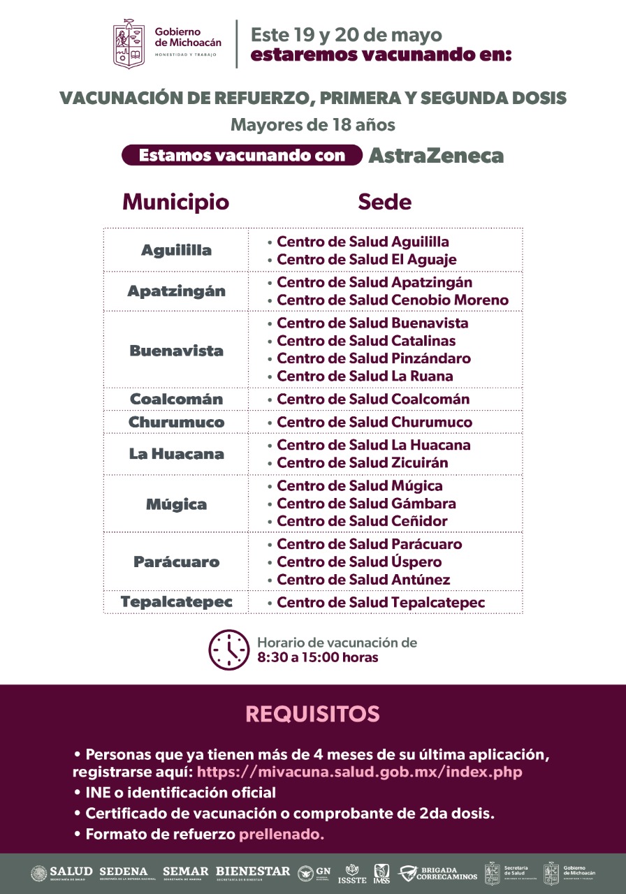 Para ello, se instalarán en los Centros de Salud de Aguililla, Apatzingán, Buenavista, Coalcomán, Churumuco, La Huacana, Múgica, Parácuaro y Tepalcatepec puestos de inmunización para la aplicación del biológico Pfizer primera dosis en menores y AstraZeneca primera y segunda dosis a los de 18 y más.