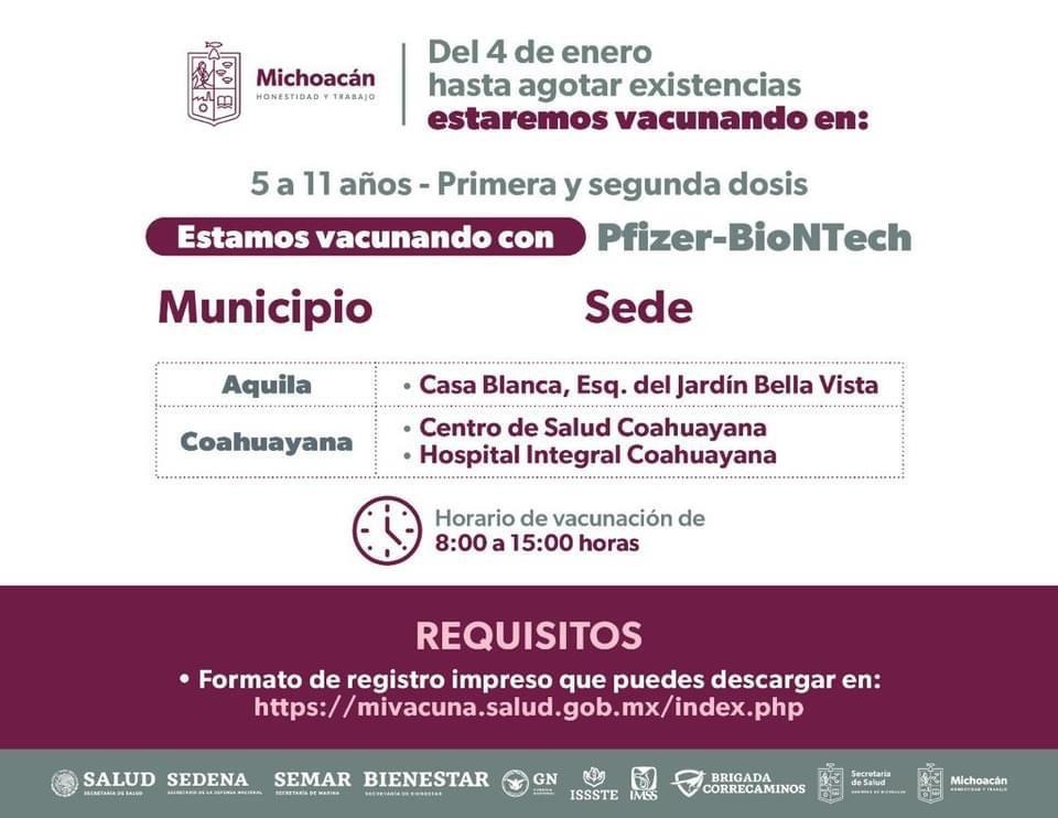 El biológico Pfizer también será aplicado hasta agotar existencia en los municipios de Arteaga, Tumbiscatío, Lázaro Cárdenas, Aquila y Coahuayana.