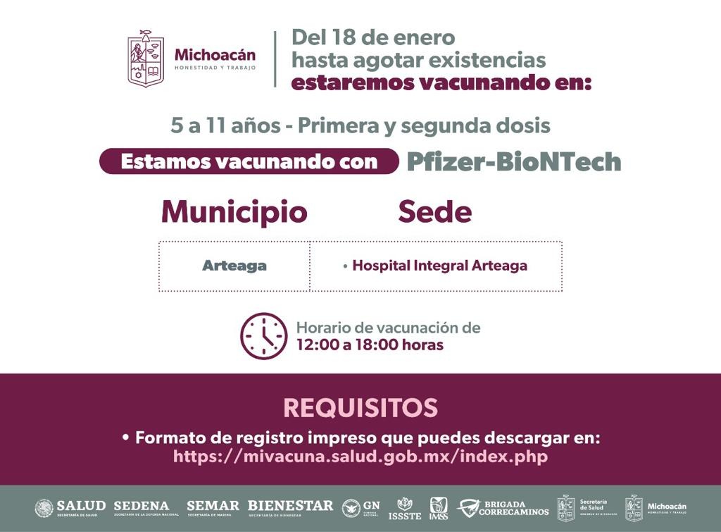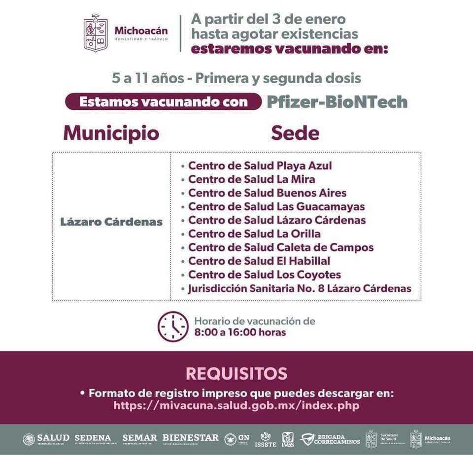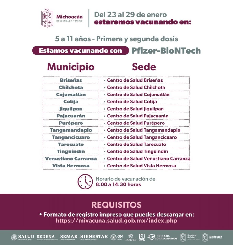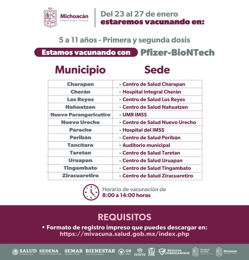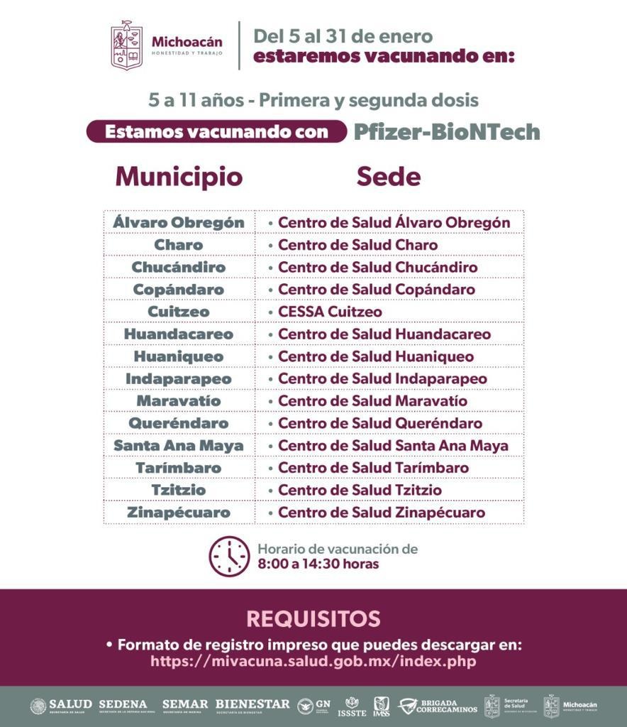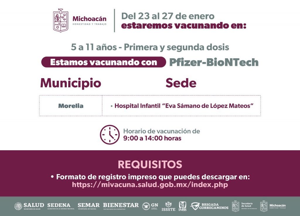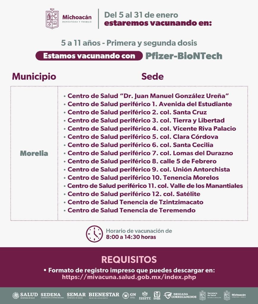 Dentro de los municipios que se encuentran vacunando está Morelia, donde desde el pasado 3 de enero y hasta el 31 se atienden a los niños y niñas en los 15 módulos habilitados en los Centros de Salud de la capital michoacana; además del que se pondrá en marcha a partir del lunes 23 hasta el 27 de enero en el Hospital Infantil “Eva Sámano de López Mateos.