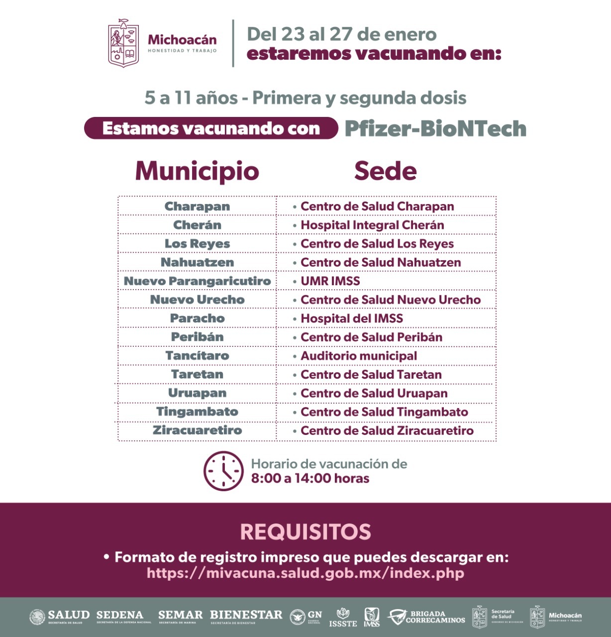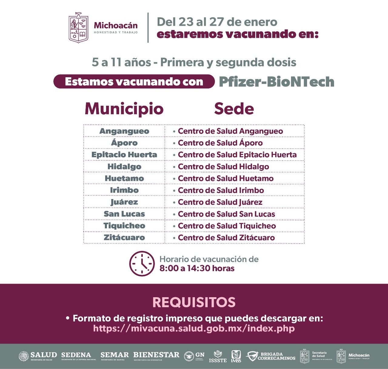 Mientras que del 23 al 27 de enero se habilitarán módulos en los Centros de Salud de Angangueo, Áporo, Epitacio Huerta, Hidalgo, Huetamo, Irimbo, Juárez, San Lucas, Tiquicheo y Zitácuaro.