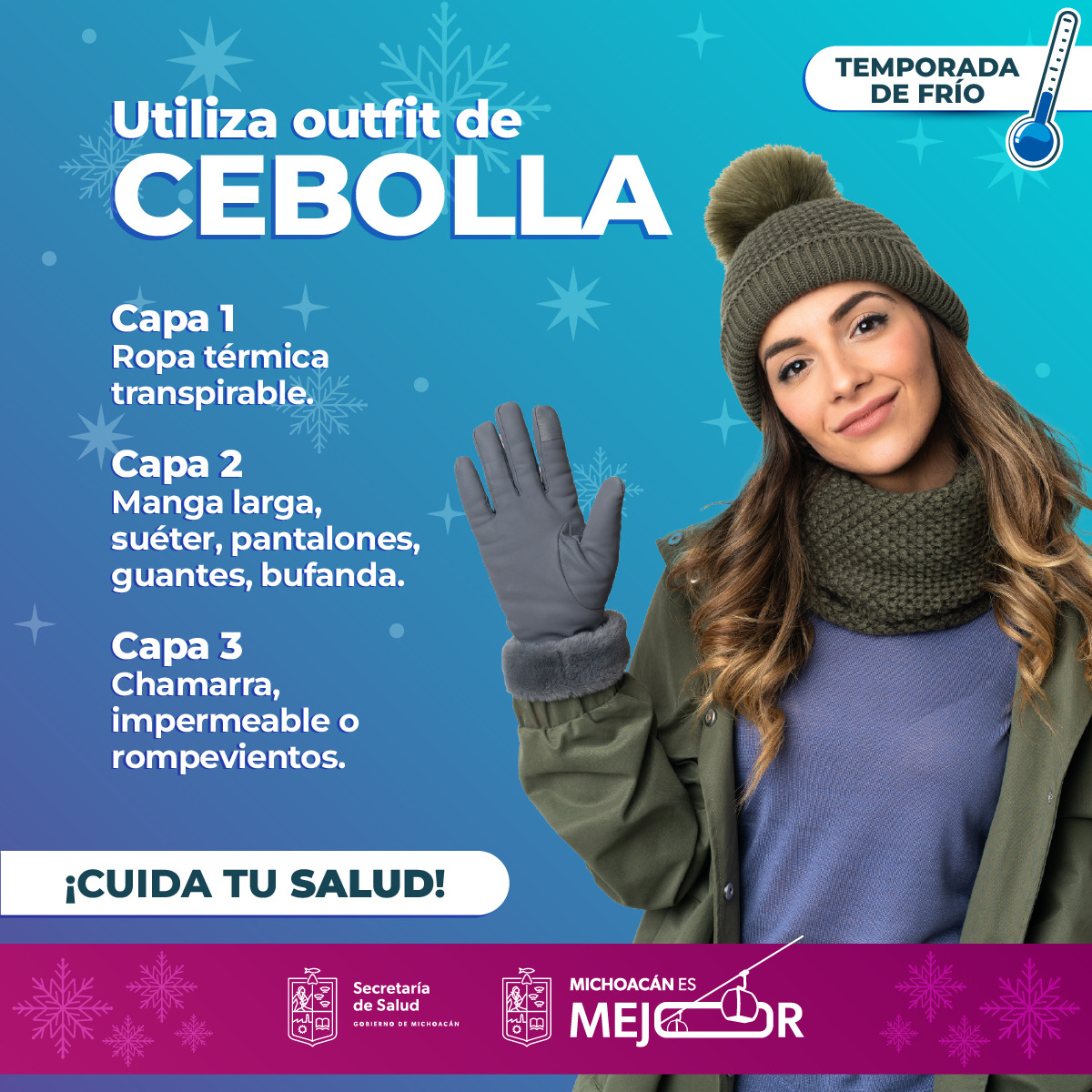 Morelia, Michoacán, 12 de diciembre de 2024.– Ante las bajas temperaturas que se registran en la entidad, la Secretaría de Salud de Michoacán (SSM) emite 15 recomendaciones para que te protejas del frío y con ellas prevengas las enfermedades respiratorias agudas.