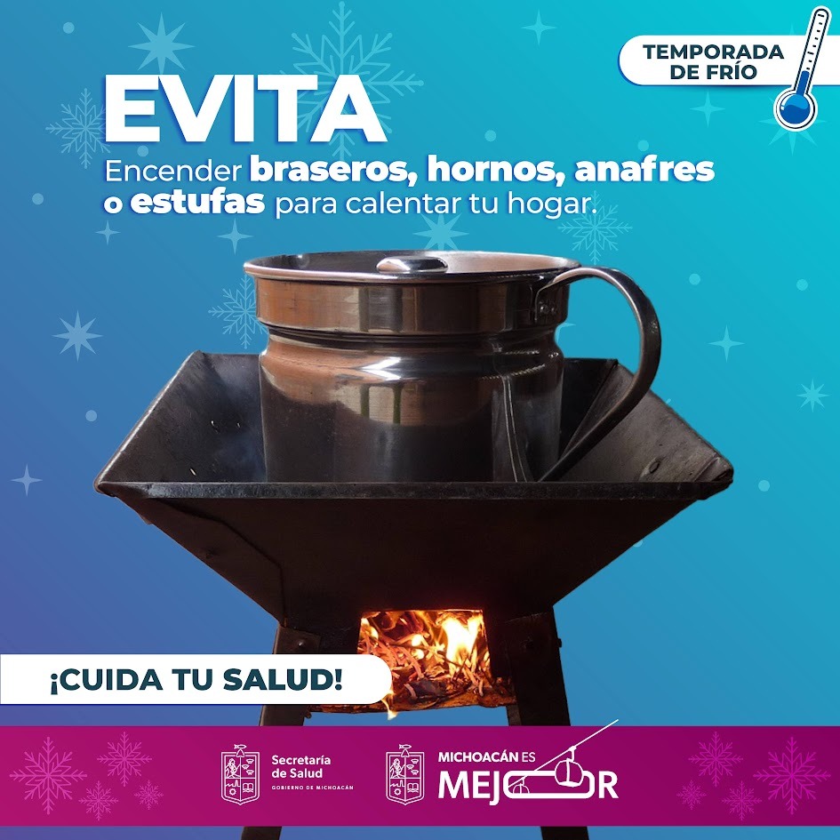 Morelia, Michoacán, 27 de diciembre de 2024.- Durante esta temporada invernal, la Secretaría de Salud de Michoacán (SSM) recomienda a la población no encender dentro del hogar fogones, braceros o la estufa para calentarse, ya que los gases que se producen son tóxicos para la salud.