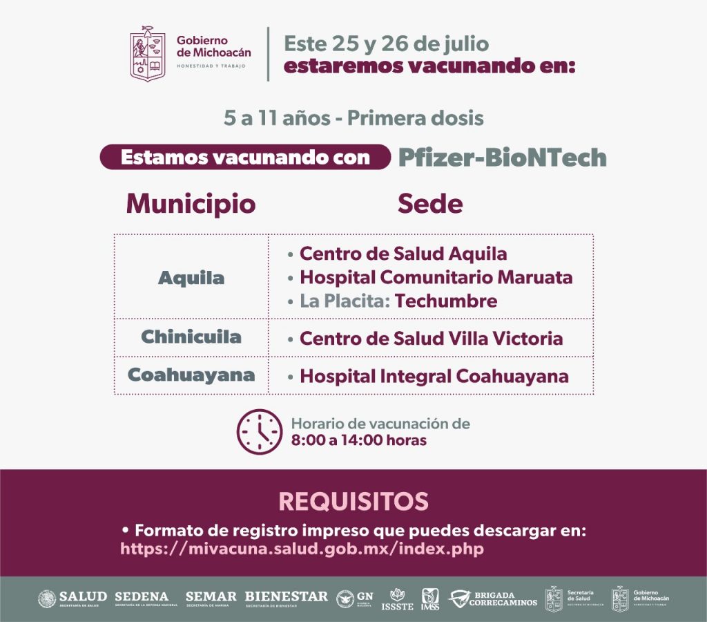 Morelia, Michoacán, 25 de julio del 2022.- Este lunes 25 de julio, se aplicarán primeras dosis de la vacuna anti Covid-19 a niños de entre 5 a 11 años de edad, en los municipios de Aquila, Coahuayana, Chinicuila e Hidalgo.