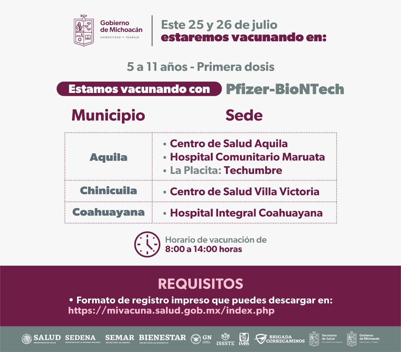 En Chinicuila la sede es el centro de salud Villa Victoria; en Coahuayana se inmunizará en el Hospital Integral y en Hidalgo el módulo se encuentra en el auditorio municipal.